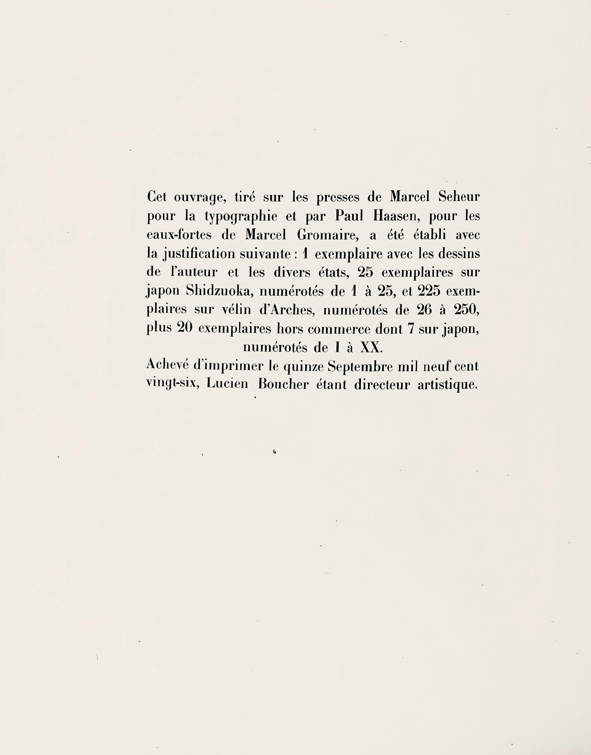Etching on vlin d'Arches paper. Paper size: 11 x 8.75 inches. Excellent condition. Inscription: Unsigned and unnumbered, as issued. Notes: From the album, Vers un monde volage. Illustr de dix eaux-fortes originales hors texte par Marcel Gromaire, 1926. Published by ditions Marcel Seheur, Paris; printed by Atelier d'art Paul Haasen, Paris, September 15, 1926. Excerpted from the album (translated from French), This album, printed on the presses of Marcel Seheur for typography and by Paul Haasen, for the etchings of Marcel Gromaire, was prepared with the following justification: 1 example with the author's drawings and the various states, 25 examples in japon Shidzuoka, numbered from 1 to 25, and 225 examples on vlin d'Arches, numbered from 26 to 250, plus 20 examples of non-commerce including 7 in japon, numbered from I to XX. Finished printing on the fifteenth of September, one thousand nine hundred and twenty-six, Lucien Boucher being artistic director.