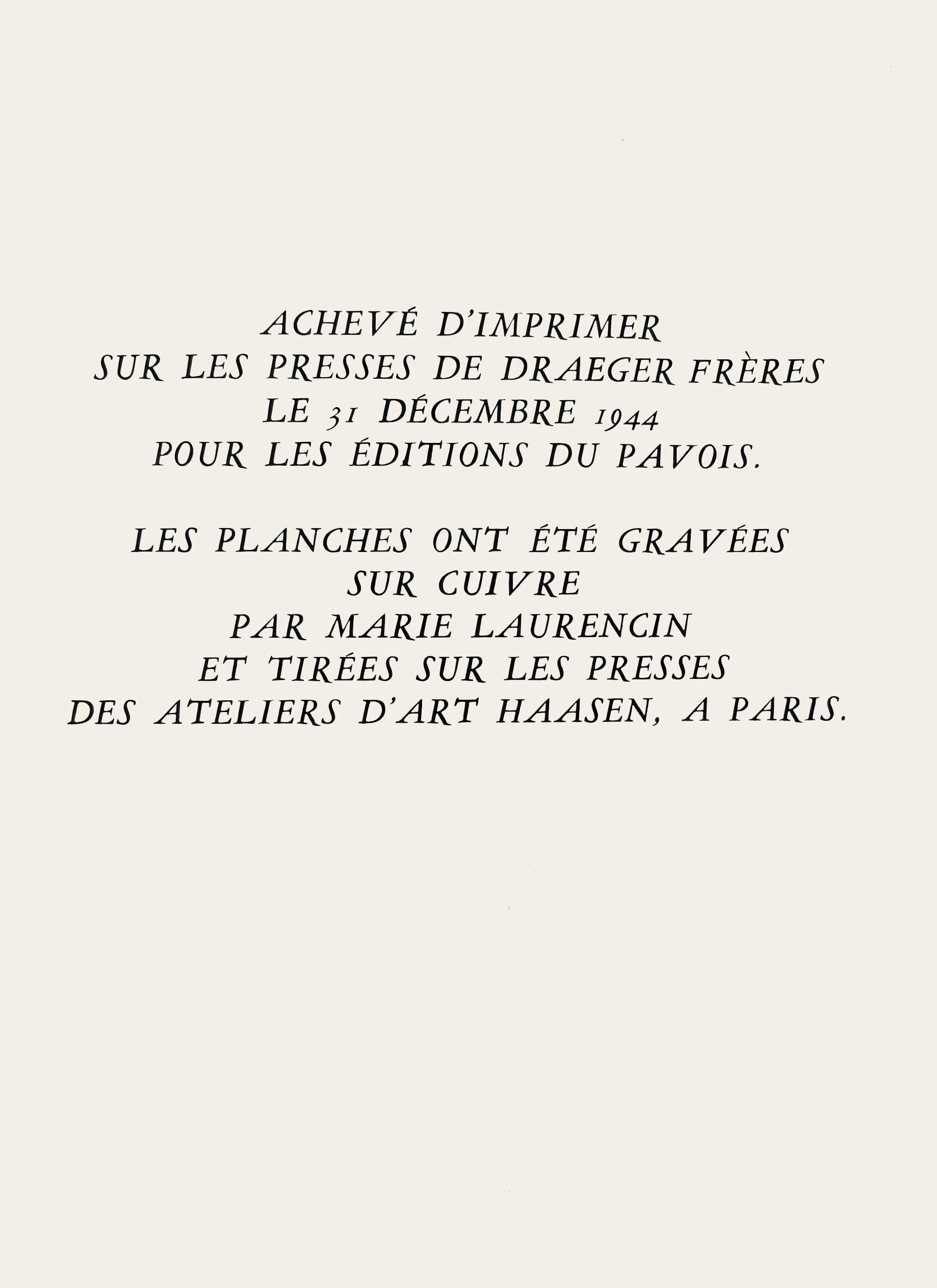 Published by ditions du Pavois, Paris; printed by Ateliers d'art Paul Haasen, Paris, December 31, 1944.