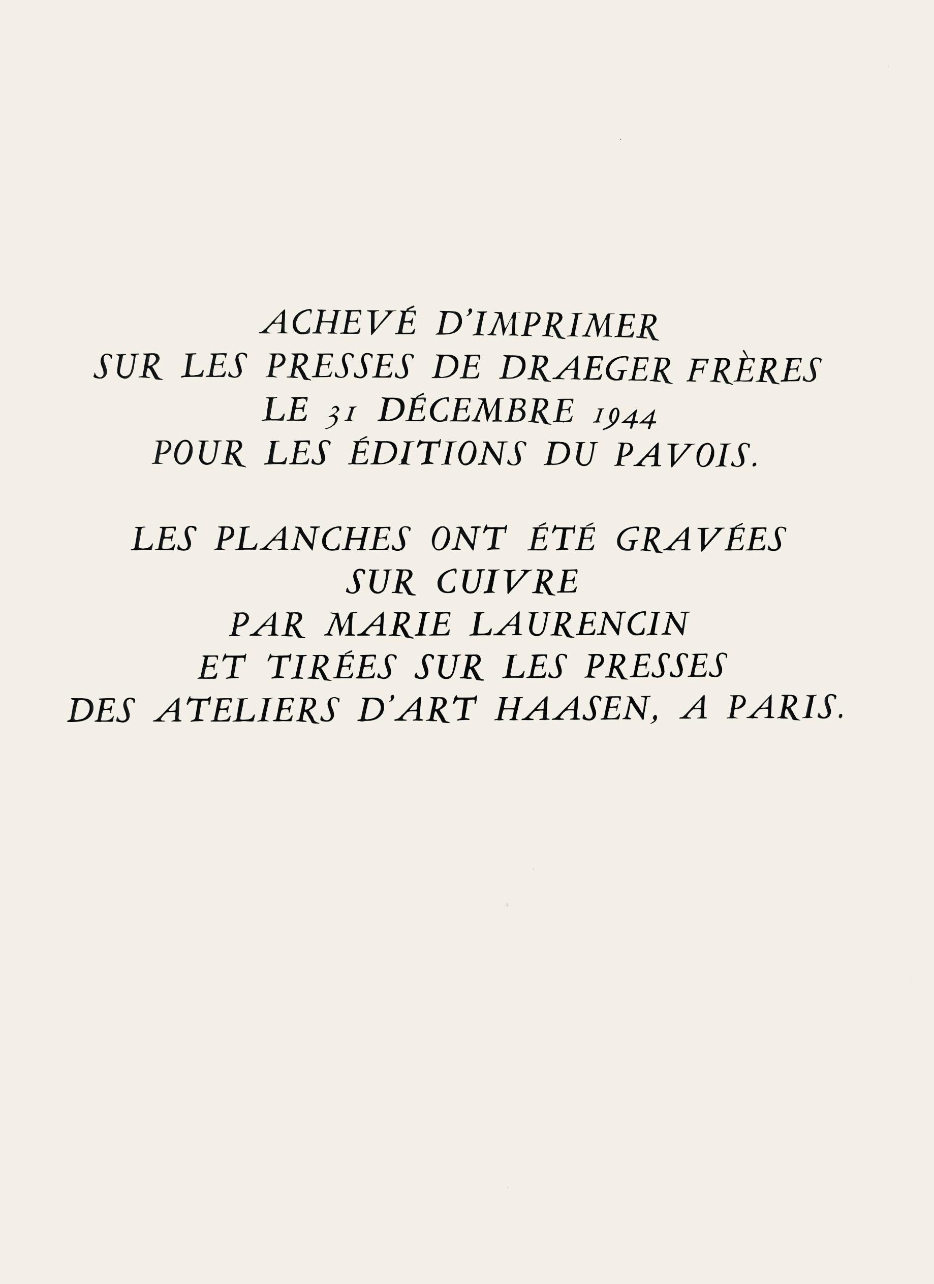 The boards were engraved, copperplate, by Marie Laurencin and printed on the presses of the Ateliers d'art Paul Haasen, in Paris.
