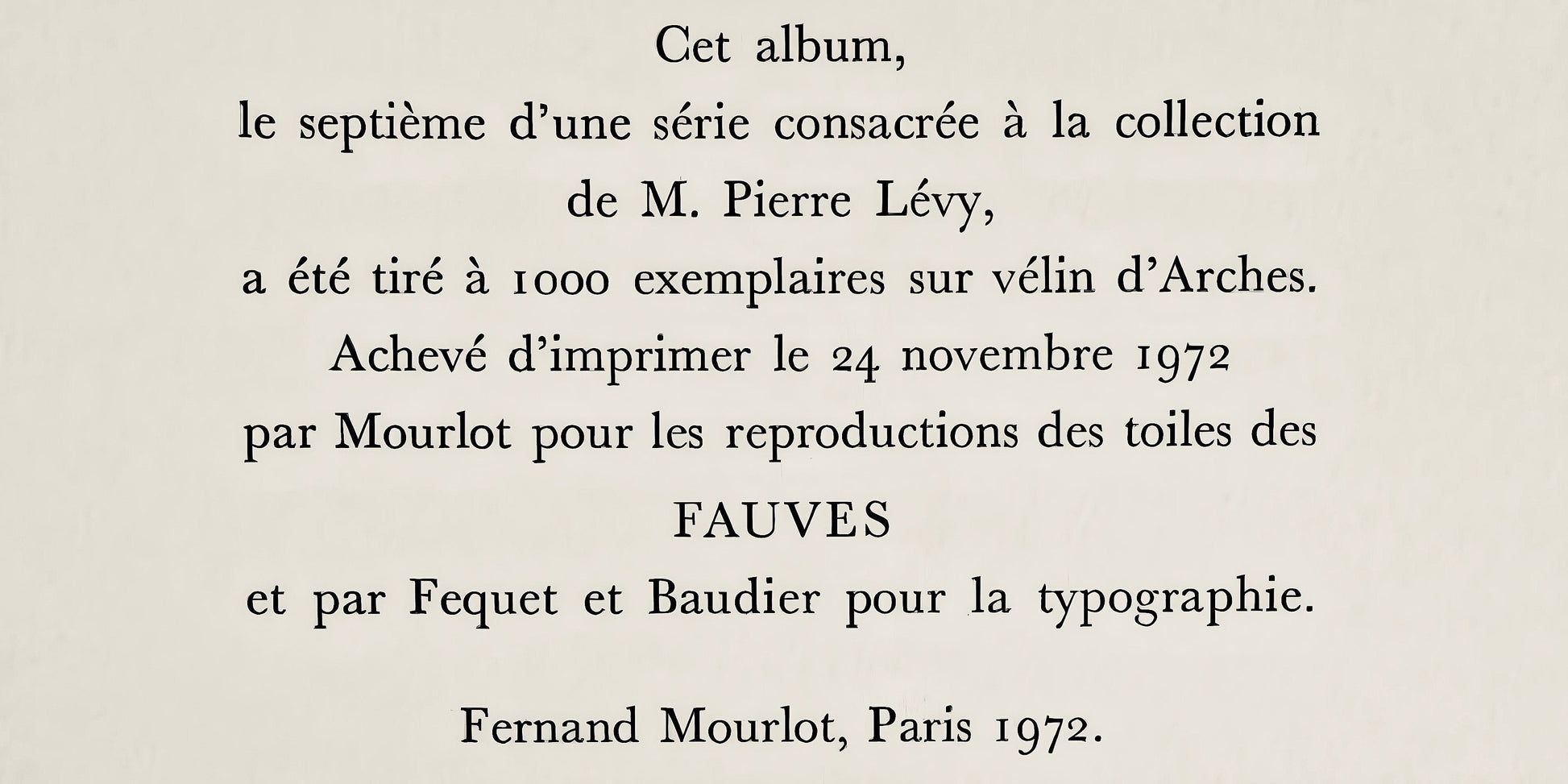 Printing was finished on November 24, 1972 by Mourlot for reproductions of the paintings of the Fauves and by Fequet and Baudier for typography. Fernand Mourlot, Paris 1972.