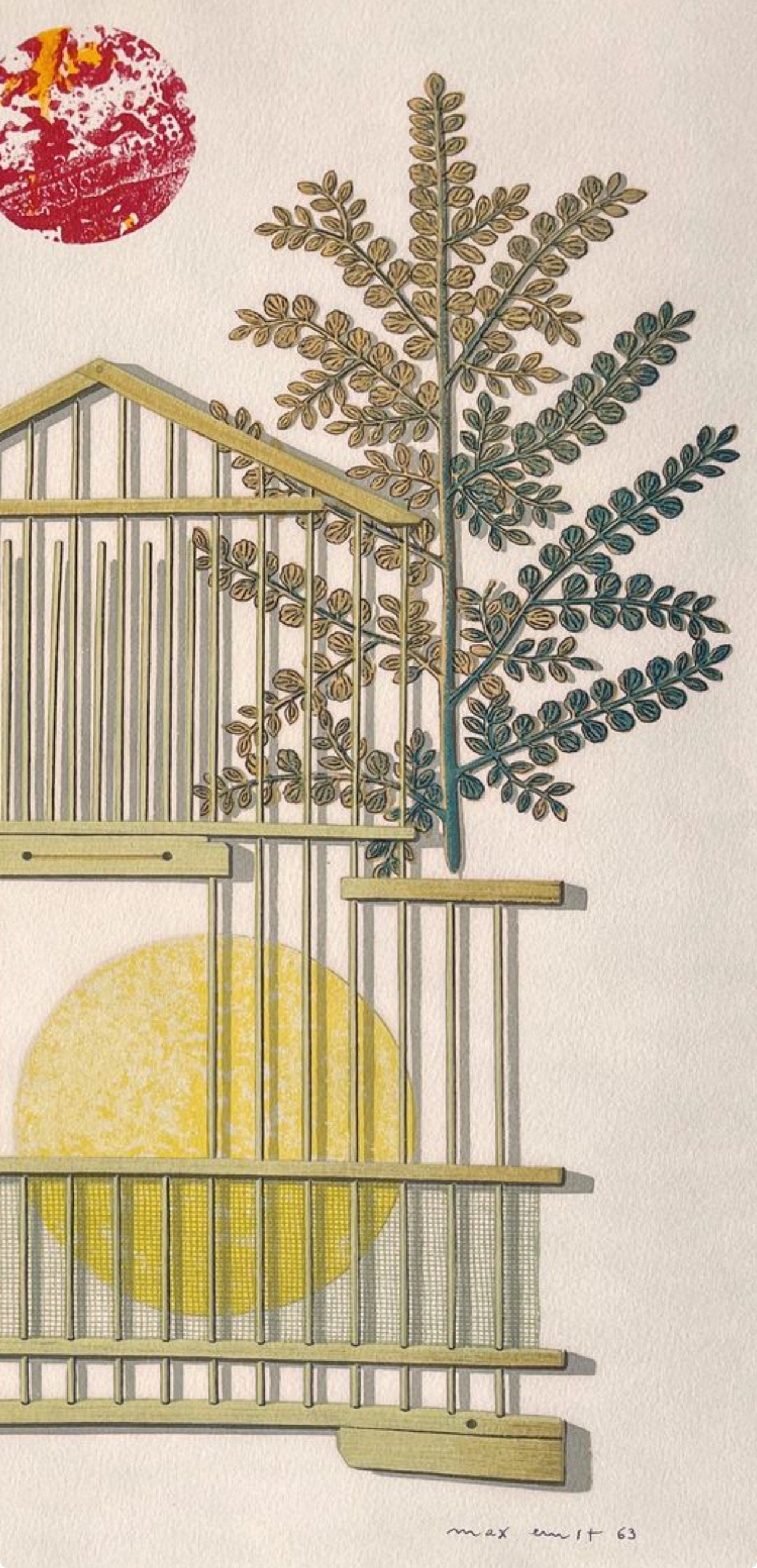 MAX ERNST (1891-1976) was a German (naturalised American in 1948 and French in 1958) painter, sculptor, printmaker, graphic artist, and poet. A prolific artist, Ernst was a primary pioneer of the Dada movement and Surrealism in Europe. He had no formal artistic training, but his experimental attitude toward the making of art resulted in his invention of frottagea technique that uses pencil rubbings of textured objects and relief surfaces to create imagesand grattage, an analogous technique in which paint is scraped across canvas to reveal the imprints of the objects placed beneath. Ernst is noted for his unconventional drawing methods as well as for creating novels and pamphlets using the method of collages. He served as a soldier for four years during World War I, and this experience left him shocked, traumatised and critical of the modern world. During World War II he was designated an "undesirable foreigner" while living in France. Ernst was in the milieu of Picasso, Dali, and Miro.