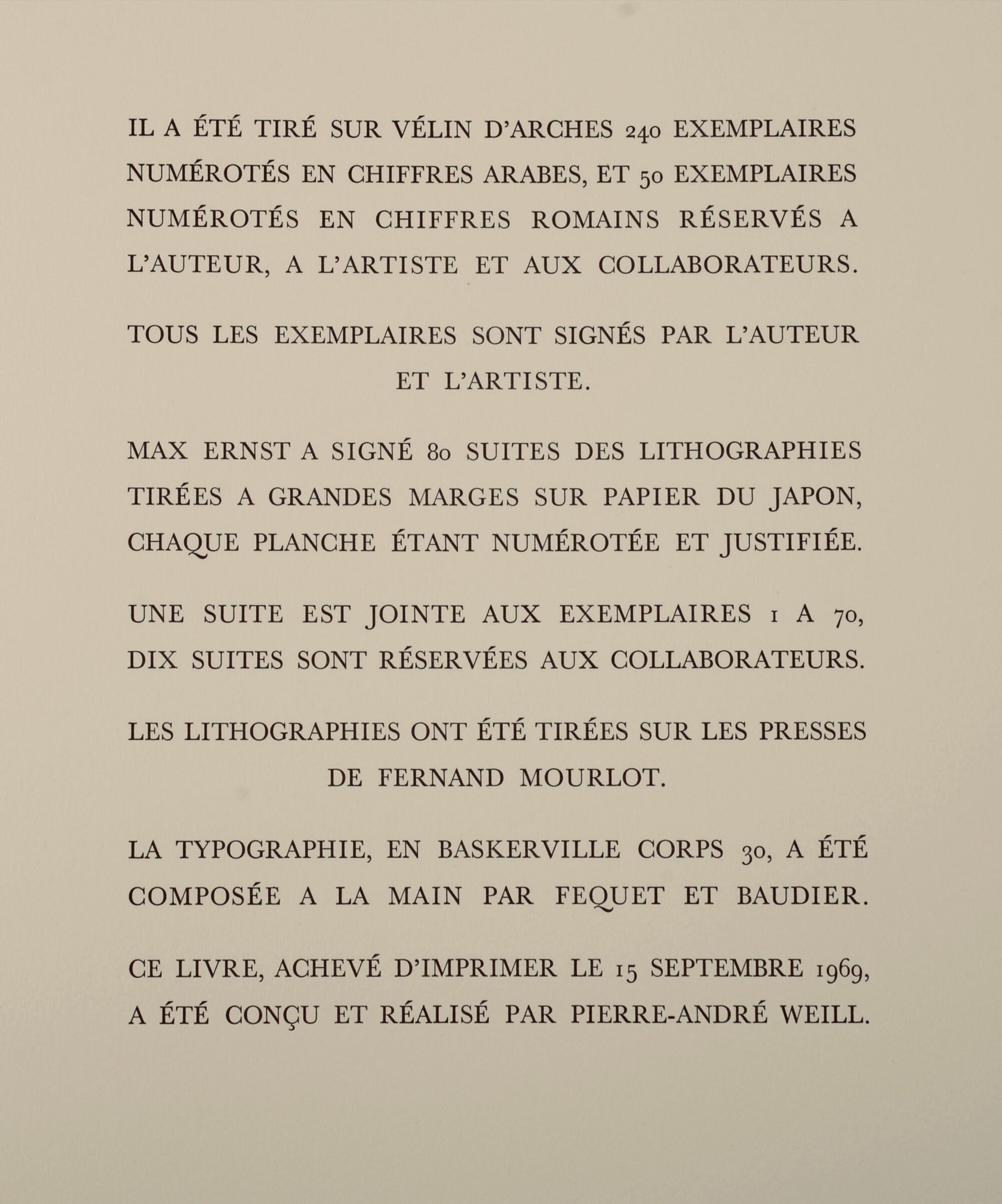 Lithograph on vlin dArches paper. Paper Size: 18.3 x 15.4 inches. Excellent condition. Inscription: unsigned and unnumbered, as issued. Notes: From the folio, Dent Prompte, Dix pomes indits illustrs par Max Ernst, de dix lithographies originales, 1969. Published Galerie Lucie Weill, Paris, Au Pont des Arts, Paris, Leon Amiel, New York; printed by Mourlot Frres, Paris, September 15, 1969. Excerpted from the folio (translated from French), It was shot on vlin d'Arches CCXL examples, numbered in Arabic, and L examples, numbered in roman numerals, reserved for the author, the artist and collaborators. All examples are signed by the author and artist. Max Ernst has signed LXXX suites of lithographs drawn at large margins on Japon, each board being numbered and justified. A suite is attached to the examples I a LXX, X suites are reserved for employees. The lithographs were printed from Fernand Mourlot's presses. The typography, in Baskerville Corps 30, was composed by hand by Fequet and Baudier. This folio, completed and printed on September 15, 1969, was designed and produced by Pierre-Andr Weill.