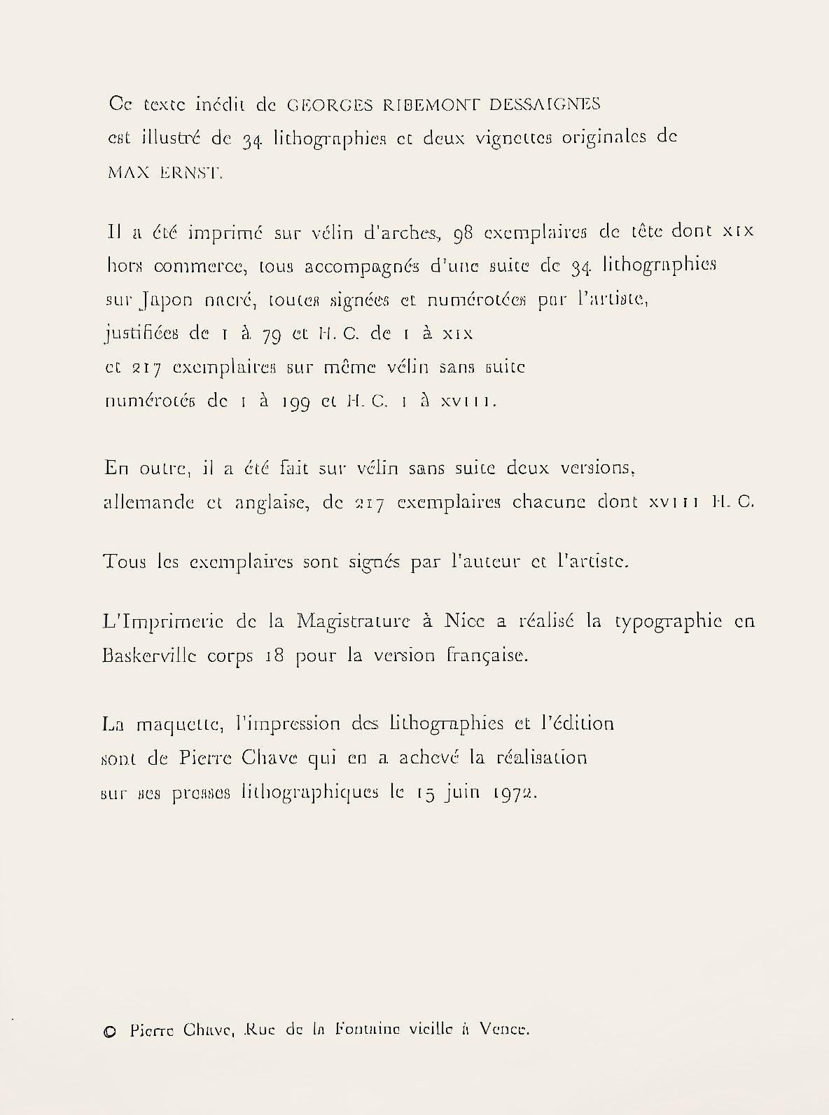 Lithograph on vlin d'Arches paper. Paper size: 21.875 x 15 inches. Excellent condition. Unsigned and unnumbered, as issued. Notes: From the folio, La Ballade du Soldat, 34 Lithographies Originales de Max Ernst, 1972. Published by manus presse, Stuttgart; printed by Pierre Chave, Vence, June 15, 1972. Excerpted from the folio (translated from French), This unpublished text by Georges Ribemont-Dessaignes is illustrated with 34 lithographs and two original vignettes of Max Ernst. It was printed on vlin d'arches, 98 tte examples, including XIX hors commerce, all accompanied by a suite of 34 lithographs on Japon nacr, all signed and numbered by the artist, justified from 1 to 79 and H.C. from I to XIX and 217 examples on mme vlin sans suite numrots from 1 to 199 and H.C. I to XVIII. In addition, two versions, German and English, of 217 examples each were made on vlin, without follow-up, XVIII H.C. All colophons are signed by the author and the artist. L'Imprimerie de la Magistrature in Nice has produced the typography in Baskerville corps 18 for the French version. The model, the printing of the lithographs and the edition were designed and shot by Pierre Chave who completed the realization on his lithographic presses on June 15, 1972. Pierre Chave, Rue de la Fontaine vieille in Vence.