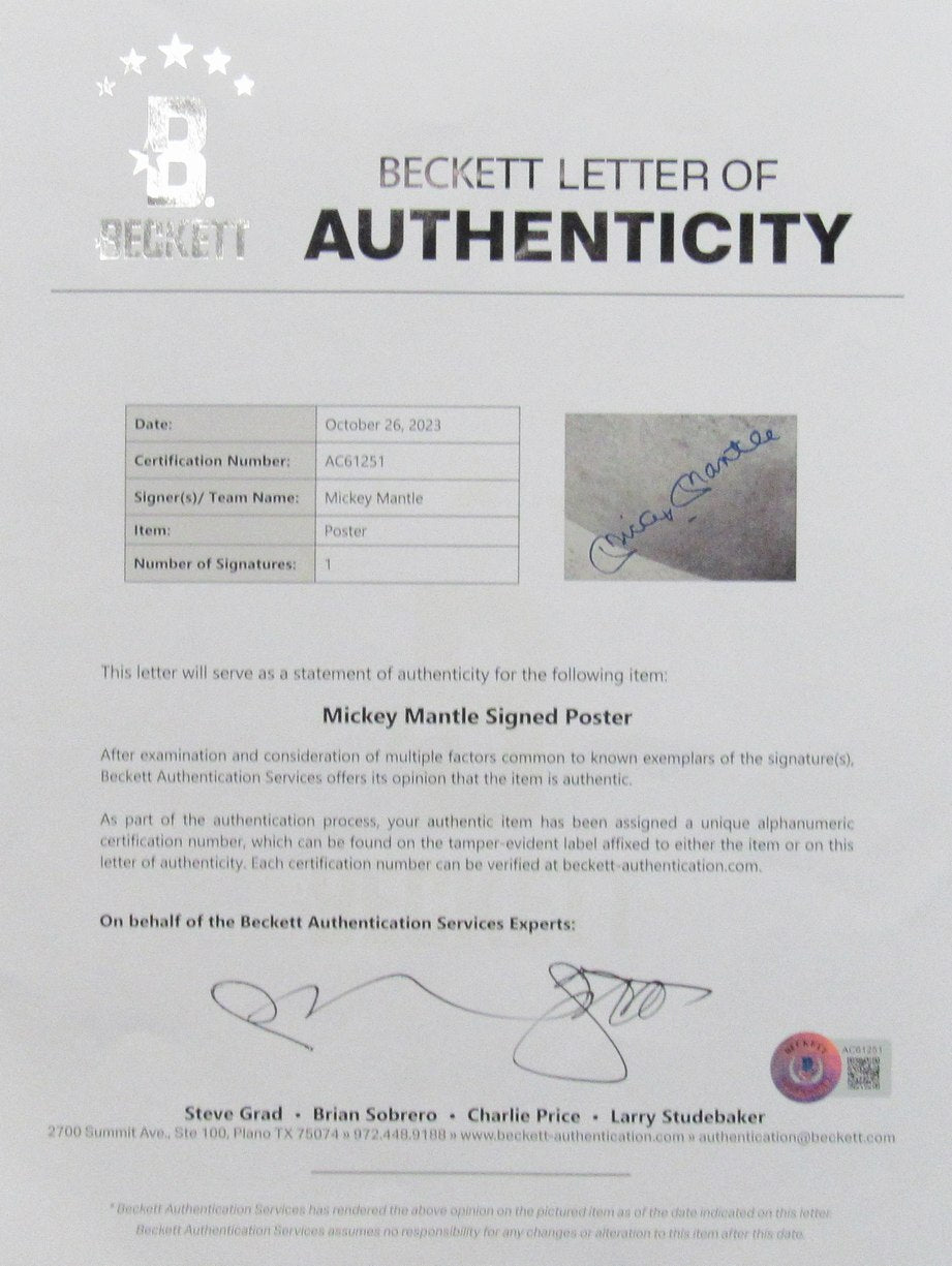 Mickey Mantle Hof Ny Yankees Signed 20X30 Photo Framed Beckett Full Loa 187381