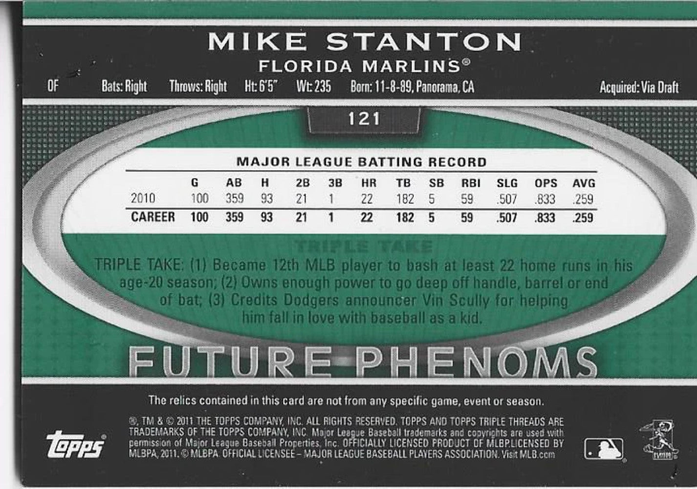 Mike Stanton 2011 Topps Triple Threads Autographed Relic Card 44/50 #121