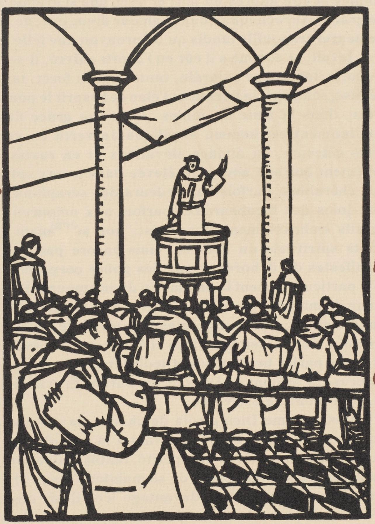 Wood engraving on verg d'Arches paper. Paper size: 12.8125 x 9.8125 inches. Excellent condition. Unsigned and unnumbered, as issued. Notes: From the volume, Les Petites Fleurs de St. Franois, 1928. Published by Ambroise Vollard, diteur, Paris; printed by l'imprimerie Fquet et Baudier, under the direction of Marthe Fquet, Paris, August 27, 1928. Excerpted from the volume (translated from French), The Little Flowers of Saint Francis was translated from Italian by Maurice Beau-Freton, illustrated with woods drawn and engraved by mile Bernard, and published in M. CM. XXVIII, by Ambroise Vollard, 28, Rue de Martignac, 28, in Paris. Printing was finished in Paris, August 27, 1928, on Marthe Fquet's press. It was taken from this volume: CCCL examples numbered on verg d'Arches. Examples I, II, and III were watercolored by the hand of mile Bernard. XLV suites, on Japon blanc nacr, and the woodblocks destroyed. In addition, XXV Hors-commerce examples with brands from A to Y.
