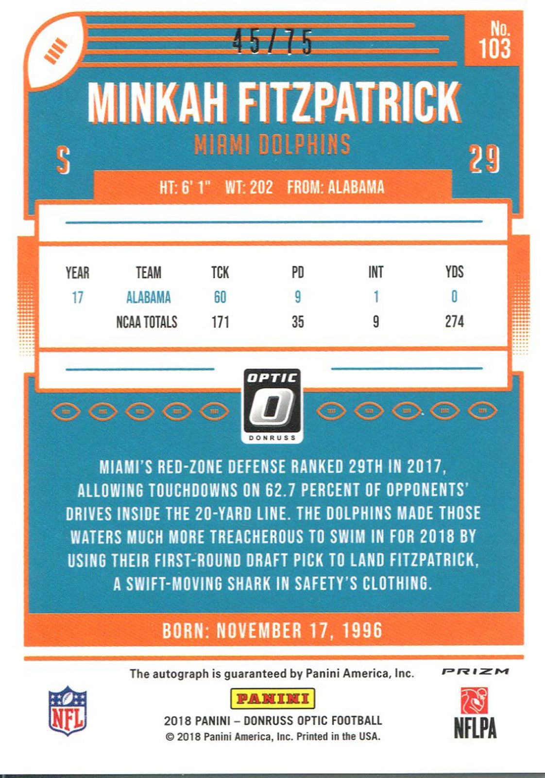 Minkah Fitzpatrick Autographed 2018 Panini Optic Rookie Card