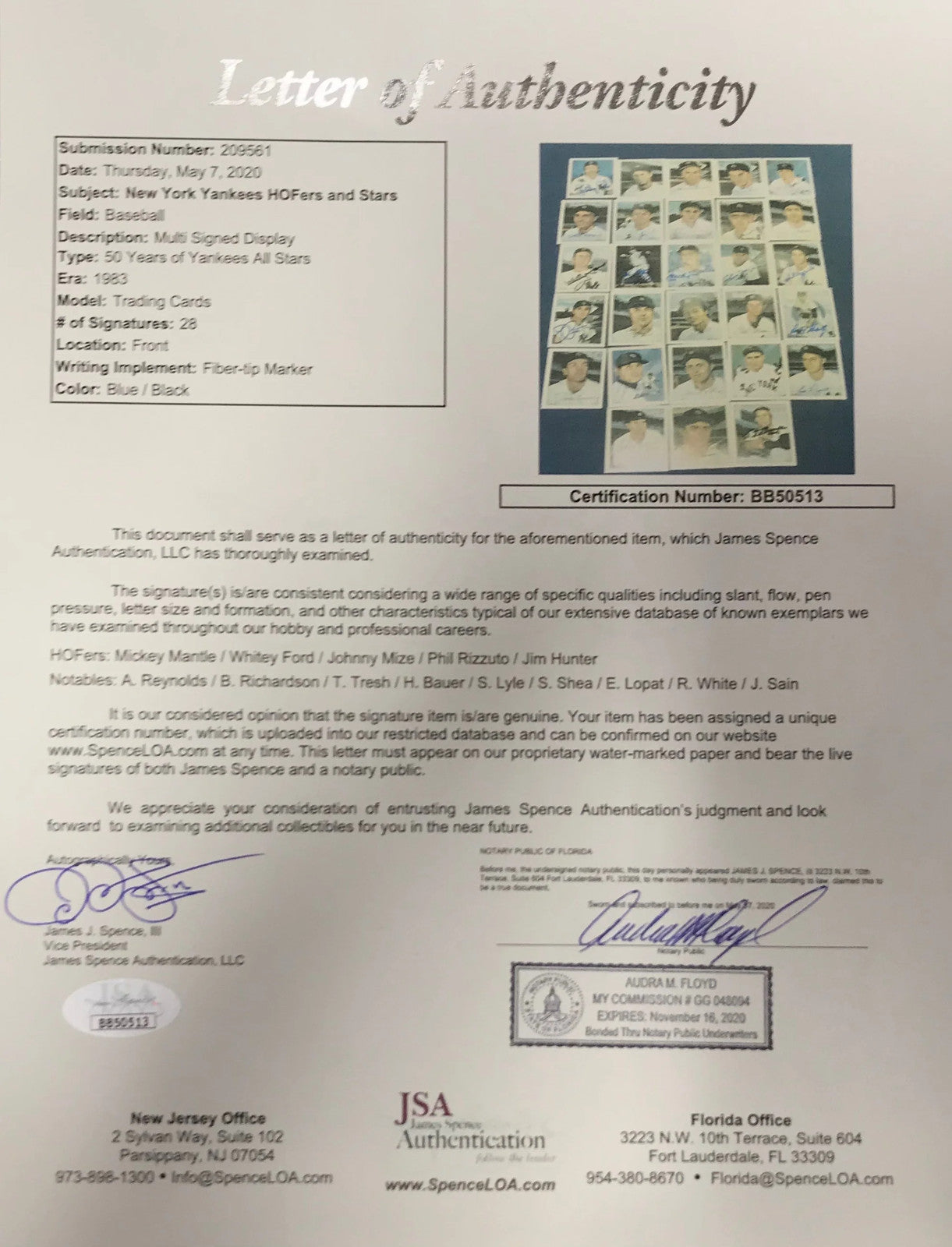 Authentication is provided by James Spence Authentication and will be accompanied with a COA from JSA, Cert # BB50513