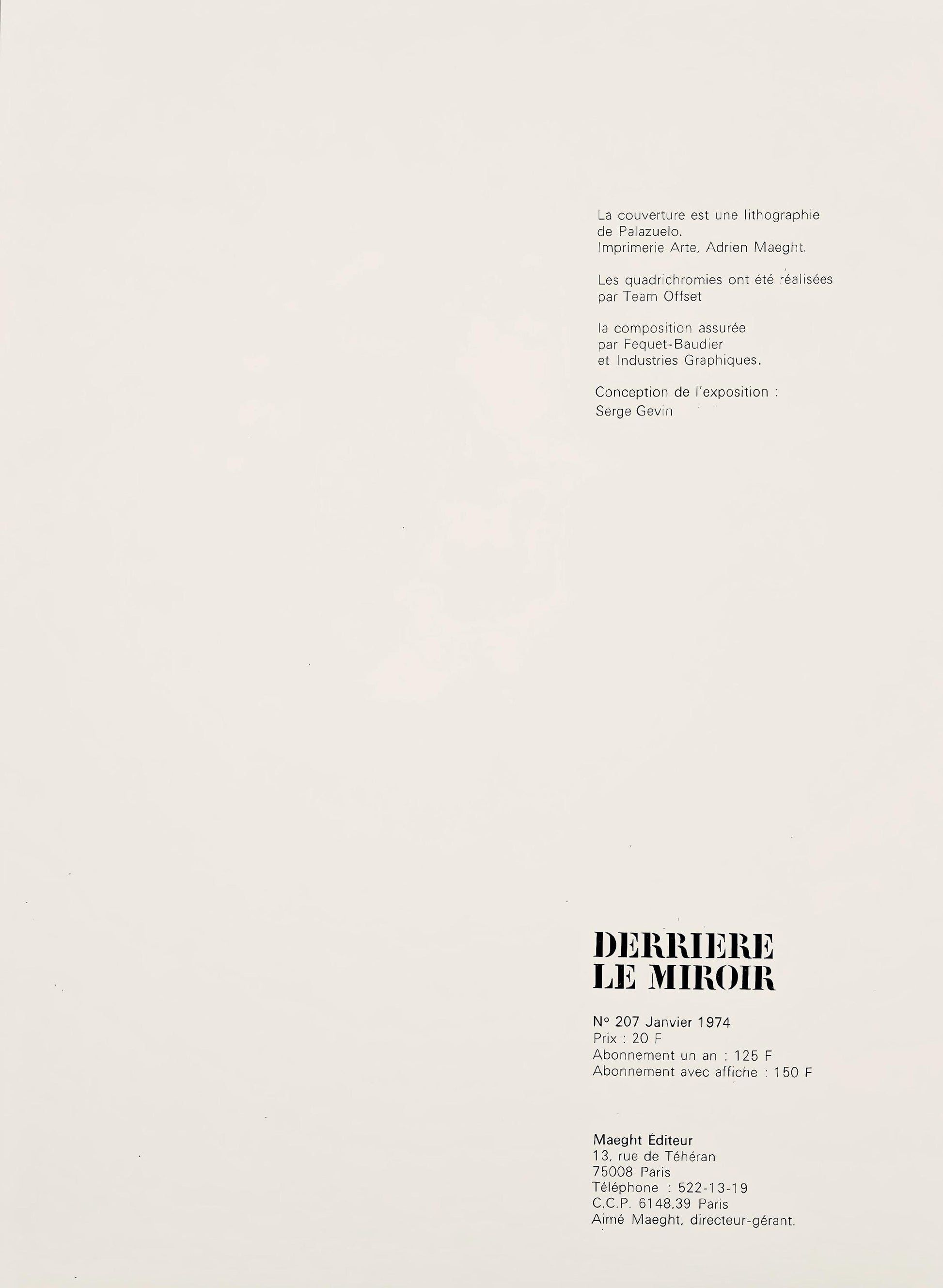 Lithograph on vlin paper. Paper size: 15 x 11 inches. Excellent condition. Inscription: Unsigned and unnumbered, as issued. Notes: From Derrire le miroir, N 207, 1974. Published by Aim Maeght, diteur, Paris; printed by ditions Pierre Feu, Galerie Maeght, Paris. Excerpted from the volume (translated from French), The cover is a lithograph by Palazuelo. Imprimerie Arte. Adrien Maeght. The quadrichromes were made by Team Offset. The composition provided by Fequet-Baudier......