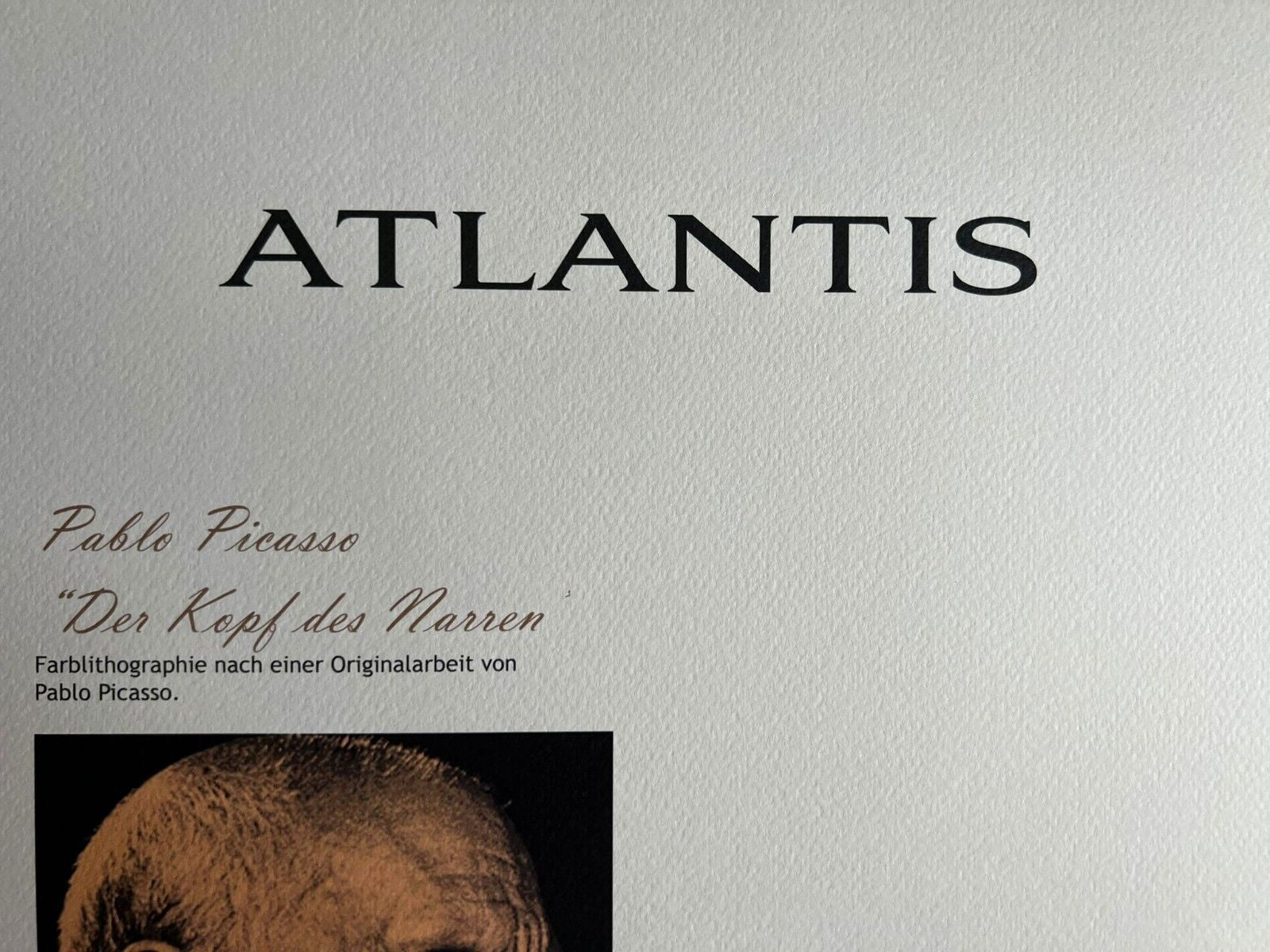 Pablo Picasso (Lithograph Signed COA) (Limited Pencil Numbered) Pablo Picasso " The head of the fool " Full sheet printed chromolitography in 1978 In 180 specimens from Atlantis Verlag, Freiburg 31 x 40 cm Signature Pablo Picasso on the slab Dry and authentic stamp of the publishing house Atlantis Kunst Verlag Freiburg Pablo Picasso "The head of the fool" Full sheet printed chromolitography in 1978In 180 specimens from Atlantis Verlag, Freiburg 31 x 40 cm Signature Pablo Picasso on the slab Dry and authentic stamp of the publishing house Atlantis Kunst Verlag Freiburg