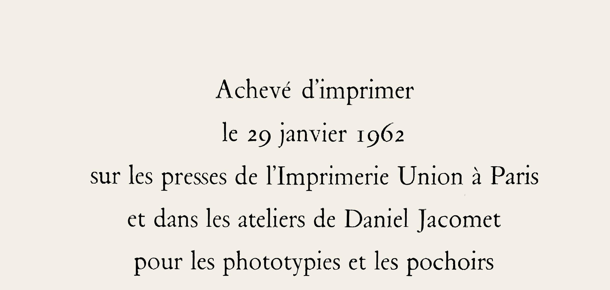 Excerpted from the folio (translated from French), Finished printing on January 29, 1962 on the presses of l'Imprimerie Union in Paris and in ateliers de Daniel Jacomet for phototypies and the pochoirs.