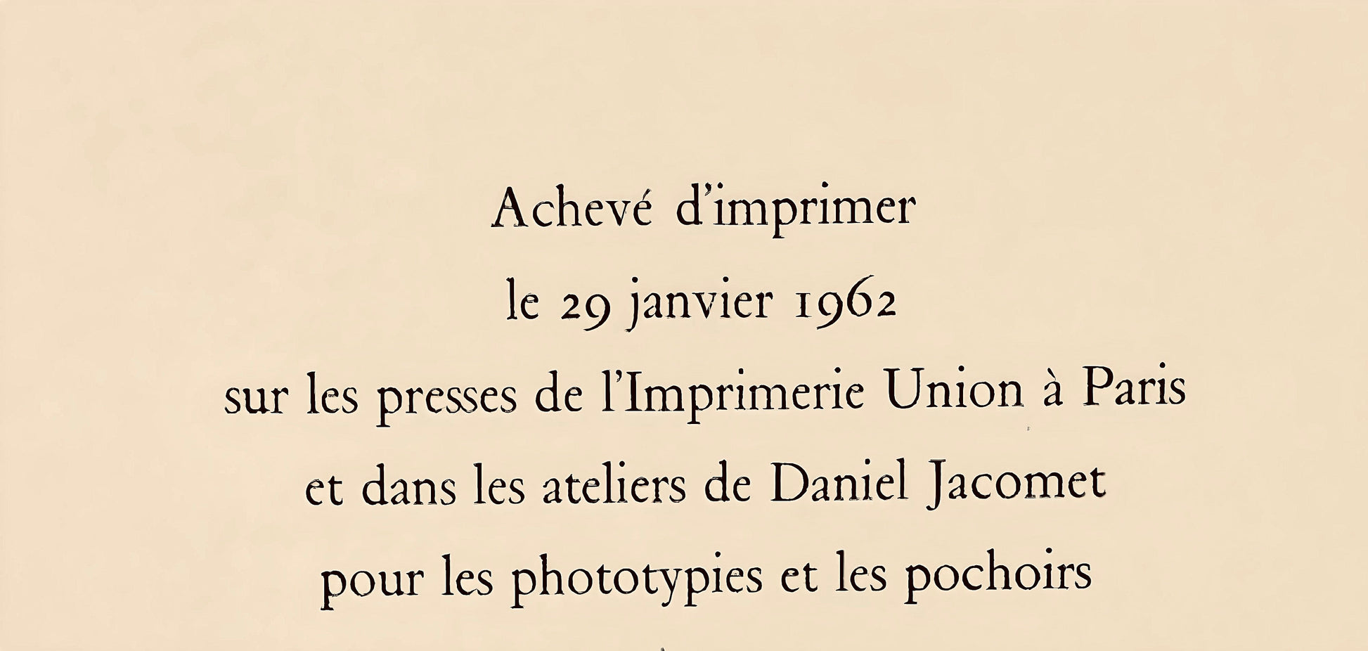 Phototype and stencil on vlin dArches paper. Unsigned and unnumbered, as issued. Paper Size: 15.625 x 11.75 inches. Excellent condition. Notes: From the folio, Diurnes Dcoupages et Photographies, 1962. Published by Galerie Berggruen et Cie, Paris; renderings and plates prepared at Atelier de Daniel Jacomet, Paris; printed by l'Imprimerie Union, Paris, January 29, 1962. Excerpted from the folio (translated from French), This publication made with the help of Lionel Prej......