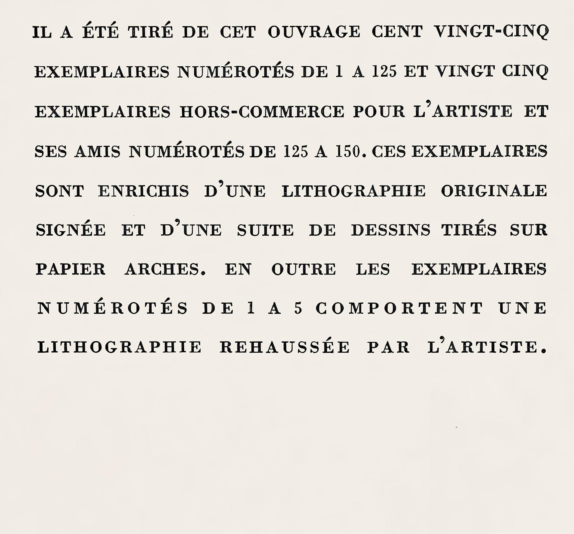 These examples are enriched with an original lithography, signed and a series of drawings drawn on Arches paper. In addition, the numbered examples of I to V have a lithography enhanced by the artist.