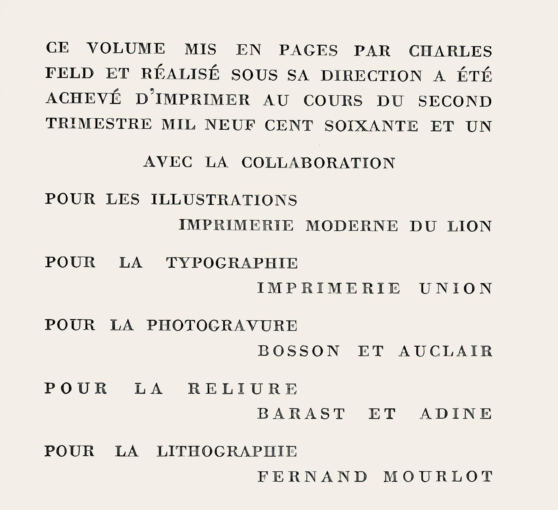 Excerpted from the album (translated from French), This album, edited by Charles Feld and realized under his direction was completed printing during the second quarter, One Thousand Nine Hundred Sixty-One, with the collaboration for the illustrations, Imprimerie Moderne du Lion; for typographie, Imprimerie Union; for photogravure, Bosson et Auclair; for the binding, Barast et Adine; for the lithography, Fernand Mourlot.