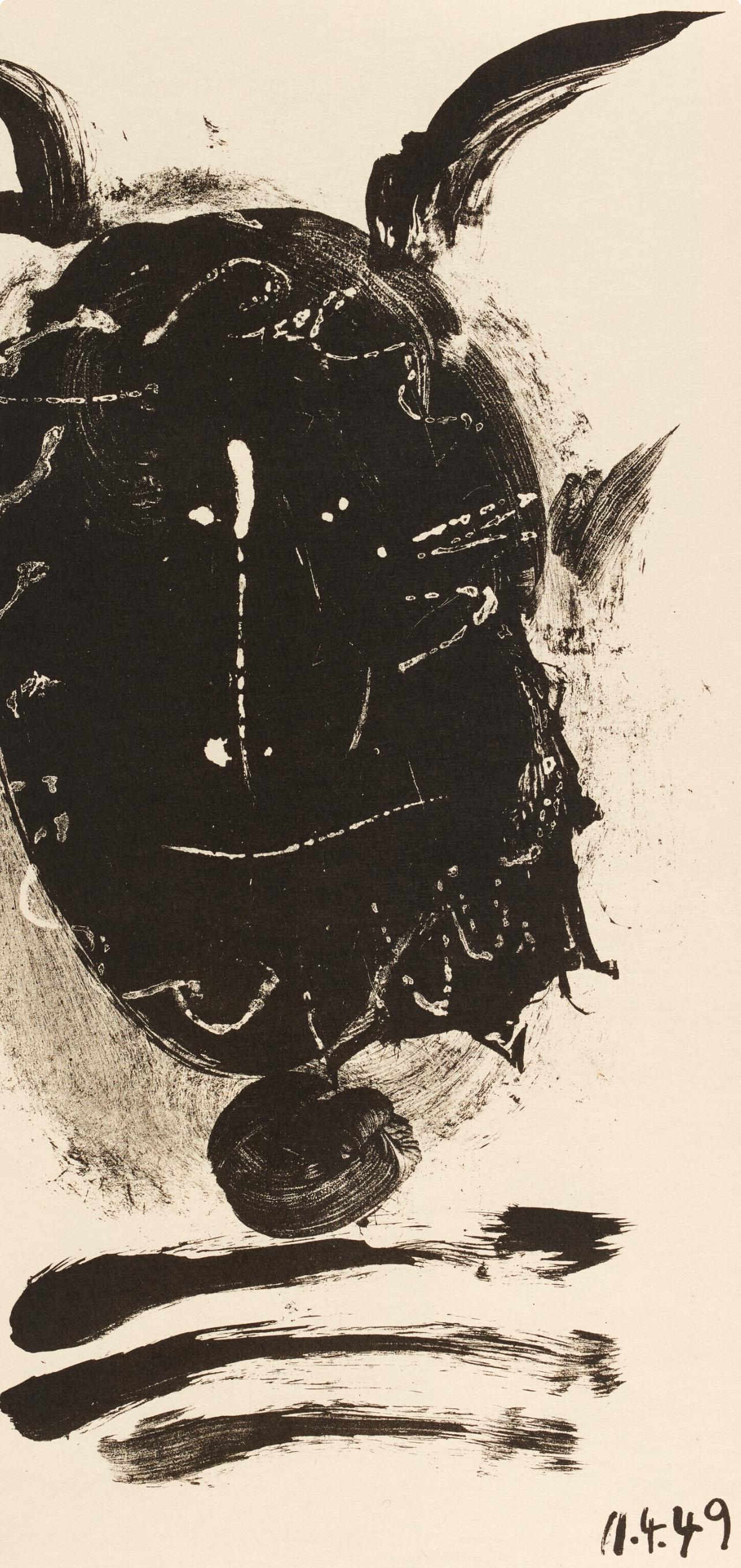 Lithograph on hand made Fabriano vlin paper mounted on museum board, as issued. Paper Size: 12.75 x 9.75 inches. Excellent condition. Inscription: Unsigned and unnumbered, as issued. Notes: From the volume, Elegy of Ihpetonga and Masks of Ashes with four original lithographs by Pablo Picasso, 1954. Published by The Noonday Press, New York; printed by Mourlot Frres, Paris, 1954. Excerpted from the volume, This book was designed by Alvin Lustig and printed on hand made F......