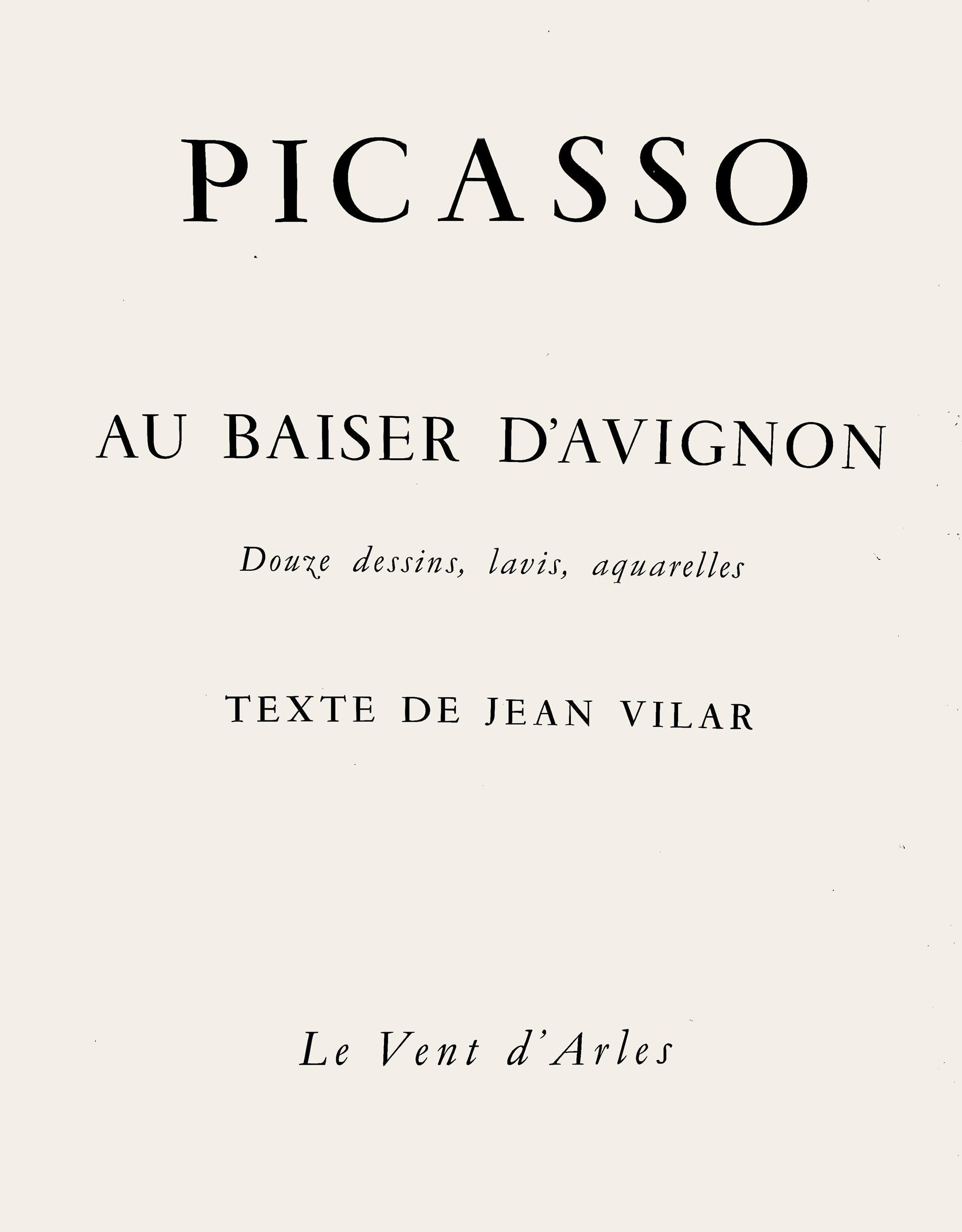 Lithograph on vlin dArches paper. Paper size: 19.625 x 15.75 inches. Excellent condition. Signed in the plate and unnumbered, as issued. Notes: From the folio, Picasso au baiser d'Avignon, douze dessins, lavis, aquarelles, 1971. Published by Le Vent d'Arles, Paris; printed by Mourlot Frres, Paris, Monday, December 20, 1971. Excerpted from the folio (translated from French), Printing was completed, Monday, December 20, 1971 on the presses of l'Imprimerie Union in Paris for typography. The boards have been pulled by Mourlot in Paris. Limited edition of 300 examples, of which 50 are out of trade.