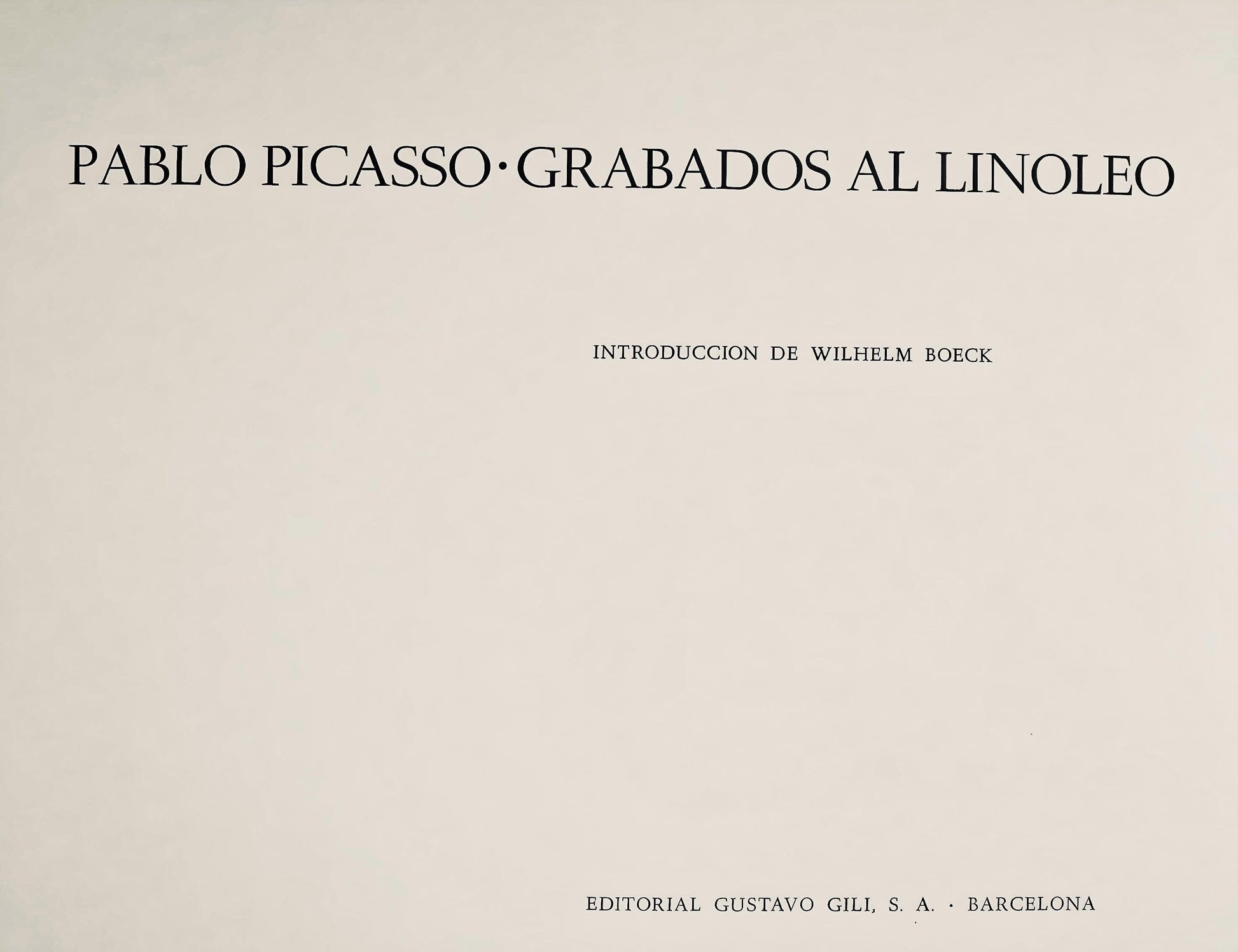 Linocut on vlin paper. Unsigned and unnumbered, as issued. Size: 14 x 12 inches. Excellent condition. Notes: From the album, Pablo Picasso: Grabados al linleo. Published by Gustavo Gili, S.A., Barcelona, and France ditions Cercle d'Art, Paris; printed by Verlag Gerd Hatje, Stuttgart, 1962. Excerpted from the volume (translated from Spanish), This limited edition of the album "Pablo Picasso, engraved in linocut", appeared for release in February 1963, consists of DXX numbered examples from I to DXX. The publisher thanks the Galerie Louise Leiris, of Paris, for the transfer of the originals for printing. 1962 by Verlag Hatje, Stuttgart. Reproduction rights reserved by S. P. A. D. E. M., Paris, and Cosmopress Geneva. No. Registration B. 885. - 1962; Legal deposit B. 29.632. - 1962. Typography printed by the Sociedad Alianza de Artes Grficas (S. A. D. A, G.), Roselln, 298-300, Barcelona.