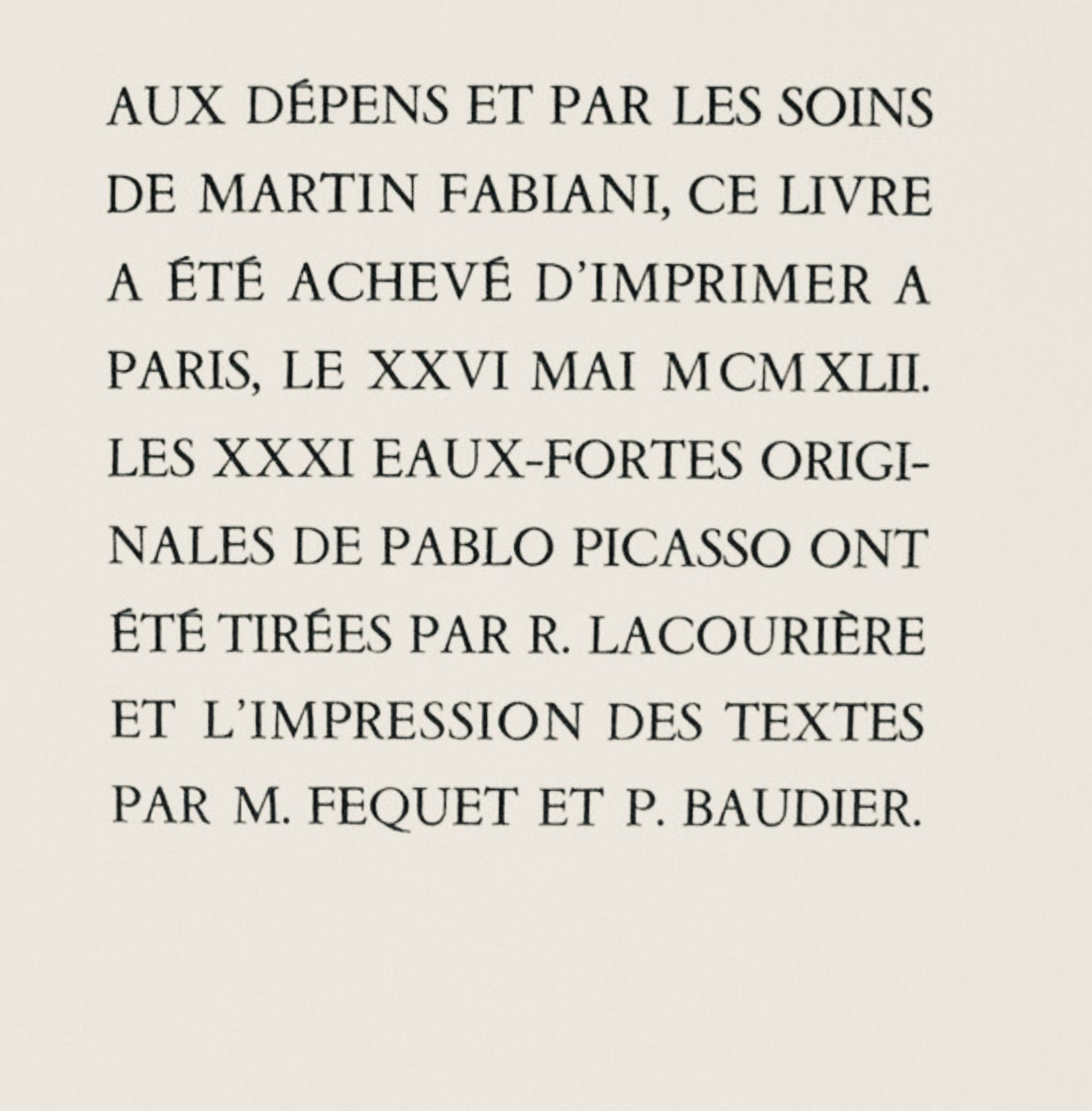 Lithograph on papier bouffant des Papeteries de Casteljoux paper. Paper Size: 13 x 9.25 inches. Unsigned and unnumbered, as issued. Excellent condition. Notes: From the folio, Eaux-fortes originale pour des textes de Buffon (Histoire naturelle), 1970. Published by Martin Fabiani, diteur, Paris, and Production Edito-Service S.A., Le Grand-Saconnex, Canton of Genve, 1970; rendered by Roger Lacourire, Paris; printed by Production Edito-Service S.A., Le Grand-Saconnex, Canton of Genve and Italy. Excerpted from the folio (translated from French), Picasso, eaux-fortes originales pour des textes de Buffon. At the expense and care of Martin Fabiani, this book was completed to be printed in paris on may XXVI MCM XLII. Pablo Picasso's original XXXI eaux-fortes were drawn by R. Lacourire and the printing of texts by M. Fequet and P. Baudier. Justification of the draw. CCXXVI examples. N1. single example on papier verg Ancien with a suite on papier Ancien bleut; II to VI. V examples on Japon SuperNacr with a sequel on Chine; VII to XXXVI. XXX examples on Japon Imprial with a suite on Chine; XXXVII to XCI. LV examples on vlin of Montval; XCII to CCXXVI. CXXXV examples on vlin de Vidalon. This facsimile edition, 25 x 33 cm, was created with the permission of Martin Fabiani, publisher in Paris, on papier bouffant des Papeteries de Casteljoux.