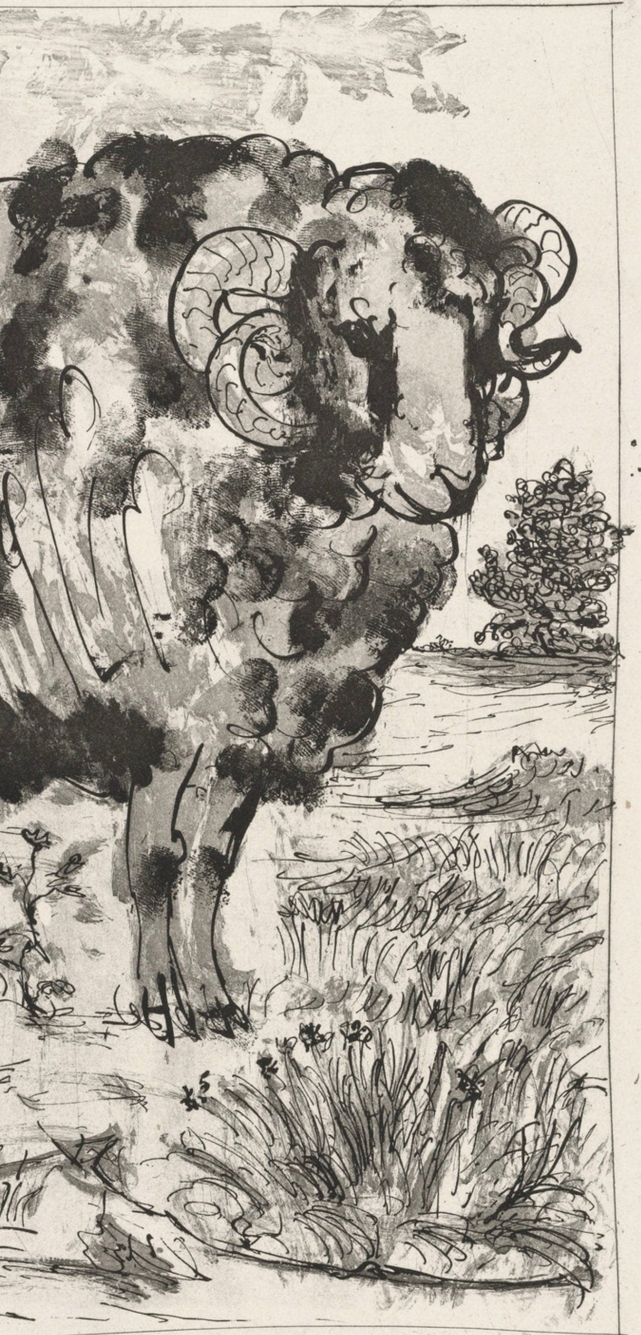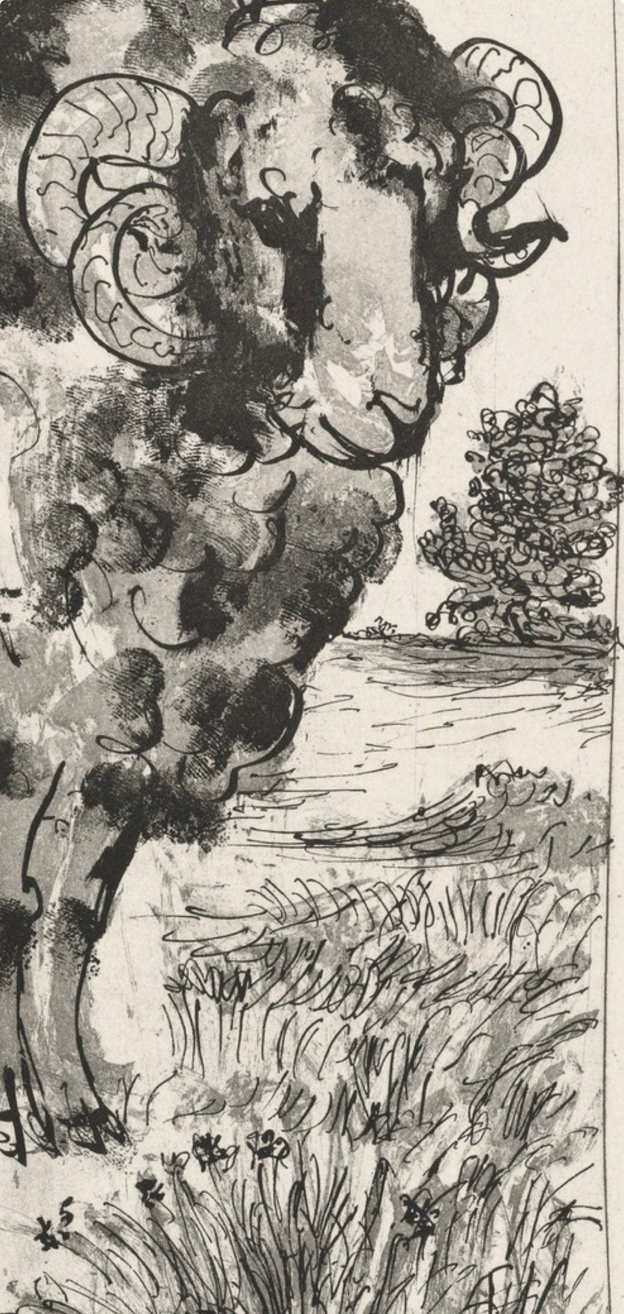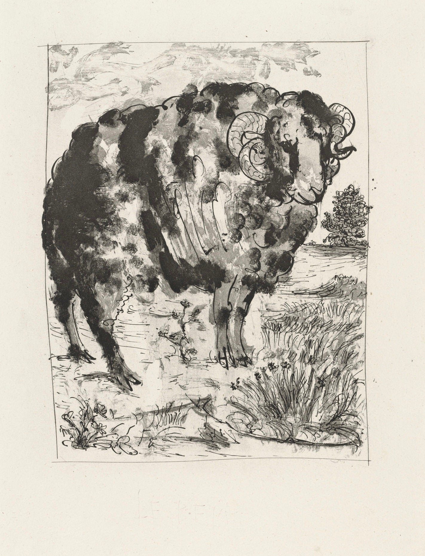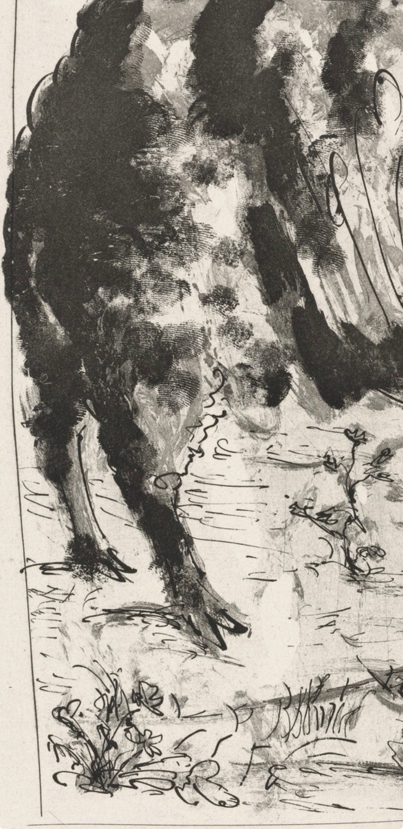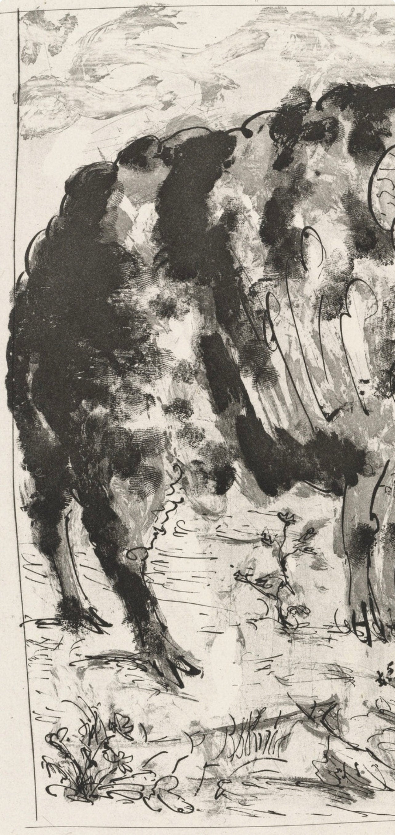 Lithograph on papier bouffant des Papeteries de Casteljoux paper. Paper Size: 13 x 9.25 inches. Unsigned and unnumbered, as issued. Excellent condition. Notes: From the folio, Eaux-fortes originale pour des textes de Buffon (Histoire naturelle), 1970. Published by Martin Fabiani, diteur, Paris, and Production Edito-Service S.A., Le Grand-Saconnex, Canton of Genve, 1970; rendered by Roger Lacourire, Paris; printed by Production Edito-Service S.A., Le Grand-Saconnex, Canton of Genve and Italy. Excerpted from the folio (translated from French), Picasso, eaux-fortes originales pour des textes de Buffon. At the expense and care of Martin Fabiani, this book was completed to be printed in paris on may XXVI MCM XLII. Pablo Picasso's original XXXI eaux-fortes were drawn by R. Lacourire and the printing of texts by M. Fequet and P. Baudier. Justification of the draw. CCXXVI examples. N1. single example on papier verg Ancien with a suite on papier Ancien bleut; II to VI. V examples on Japon SuperNacr with a sequel on Chine; VII to XXXVI. XXX examples on Japon Imprial with a suite on Chine; XXXVII to XCI. LV examples on vlin of Montval; XCII to CCXXVI. CXXXV examples on vlin de Vidalon. This facsimile edition, 25 x 33 cm, was created with the permission of Martin Fabiani, publisher in Paris, on papier bouffant des Papeteries de Casteljoux.