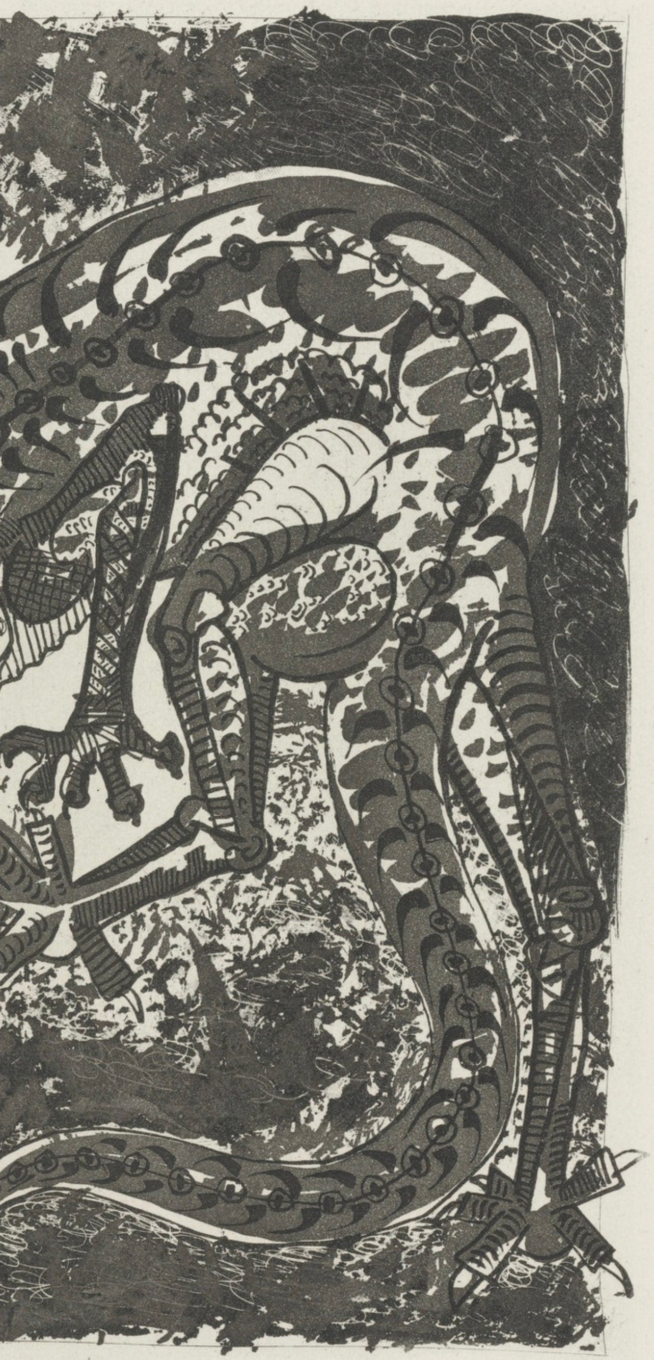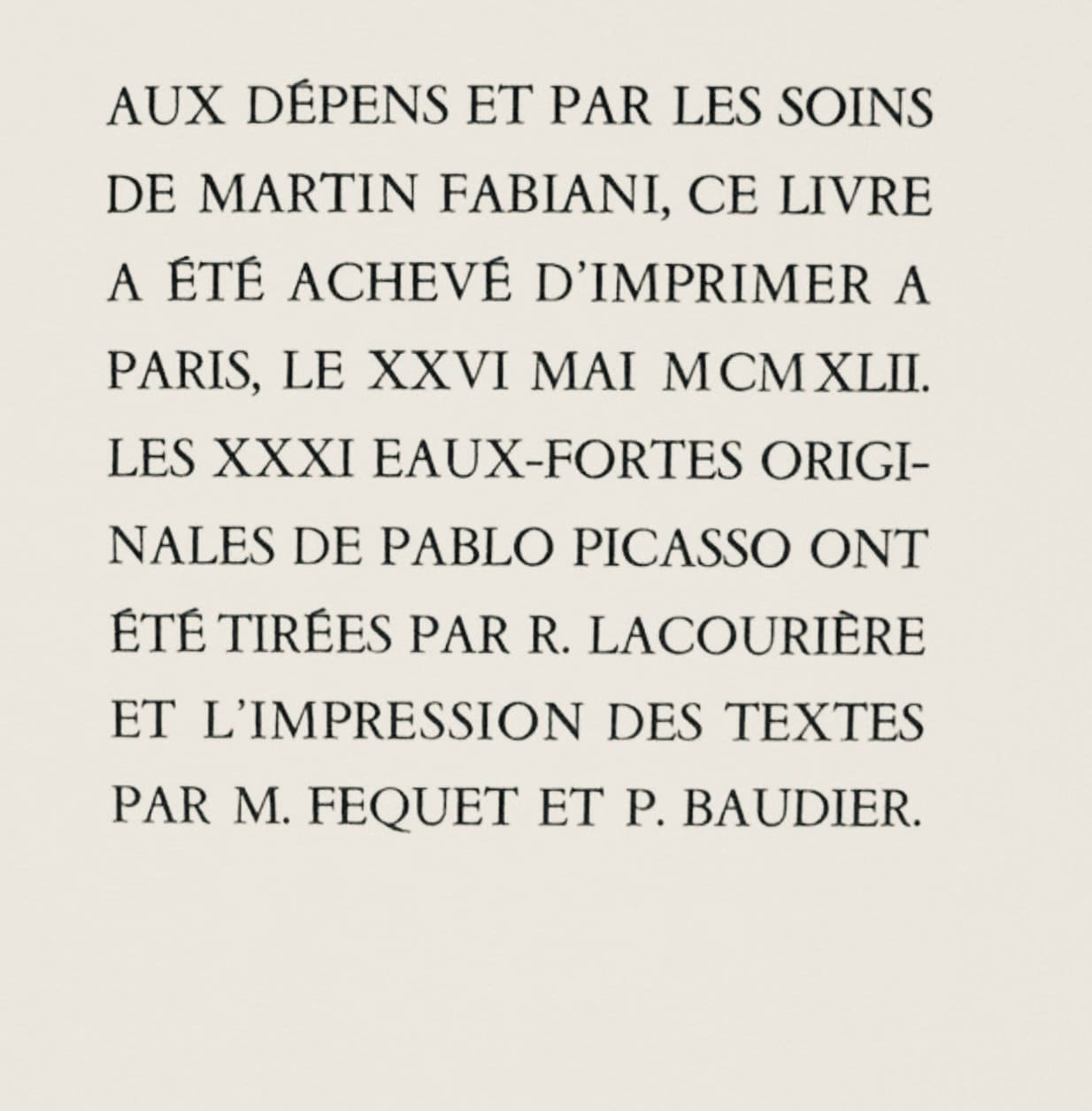 Lithograph on papier bouffant des Papeteries de Casteljoux paper. Paper Size: 13 x 9.25 inches. Unsigned and unnumbered, as issued. Excellent condition. Notes: From the folio, Eaux-fortes originale pour des textes de Buffon (Histoire naturelle), 1970. Published by Martin Fabiani, diteur, Paris, and Production Edito-Service S.A., Le Grand-Saconnex, Canton of Genve, 1970; rendered by Roger Lacourire, Paris; printed by Production Edito-Service S.A., Le Grand-Saconnex, Canton of Genve and Italy. Excerpted from the folio (translated from French), Picasso, eaux-fortes originales pour des textes de Buffon. At the expense and care of Martin Fabiani, this book was completed to be printed in paris on may XXVI MCM XLII. Pablo Picasso's original XXXI eaux-fortes were drawn by R. Lacourire and the printing of texts by M. Fequet and P. Baudier. Justification of the draw. CCXXVI examples. N1. single example on papier verg Ancien with a suite on papier Ancien bleut; II to VI. V examples on Japon SuperNacr with a sequel on Chine; VII to XXXVI. XXX examples on Japon Imprial with a suite on Chine; XXXVII to XCI. LV examples on vlin of Montval; XCII to CCXXVI. CXXXV examples on vlin de Vidalon. This facsimile edition, 25 x 33 cm, was created with the permission of Martin Fabiani, publisher in Paris, on papier bouffant des Papeteries de Casteljoux.