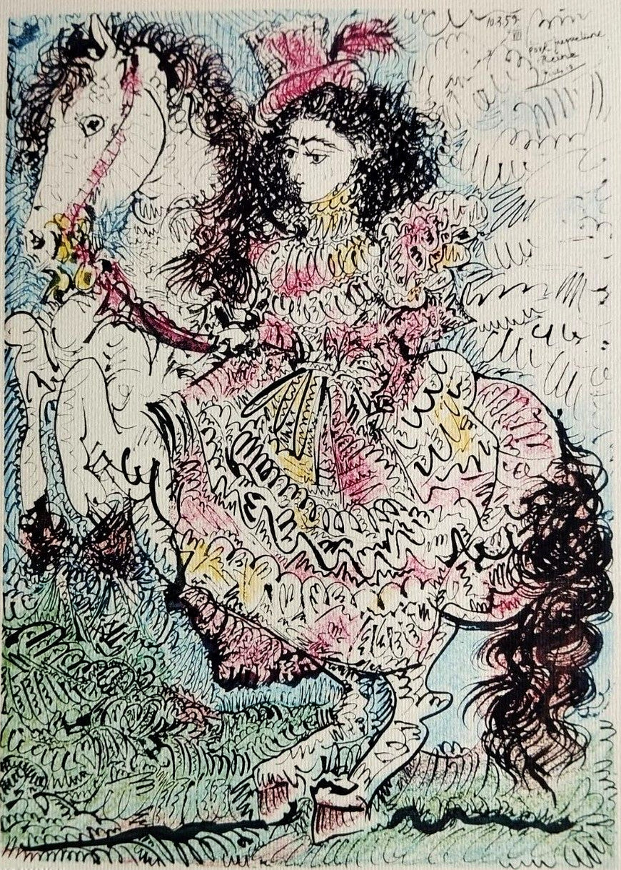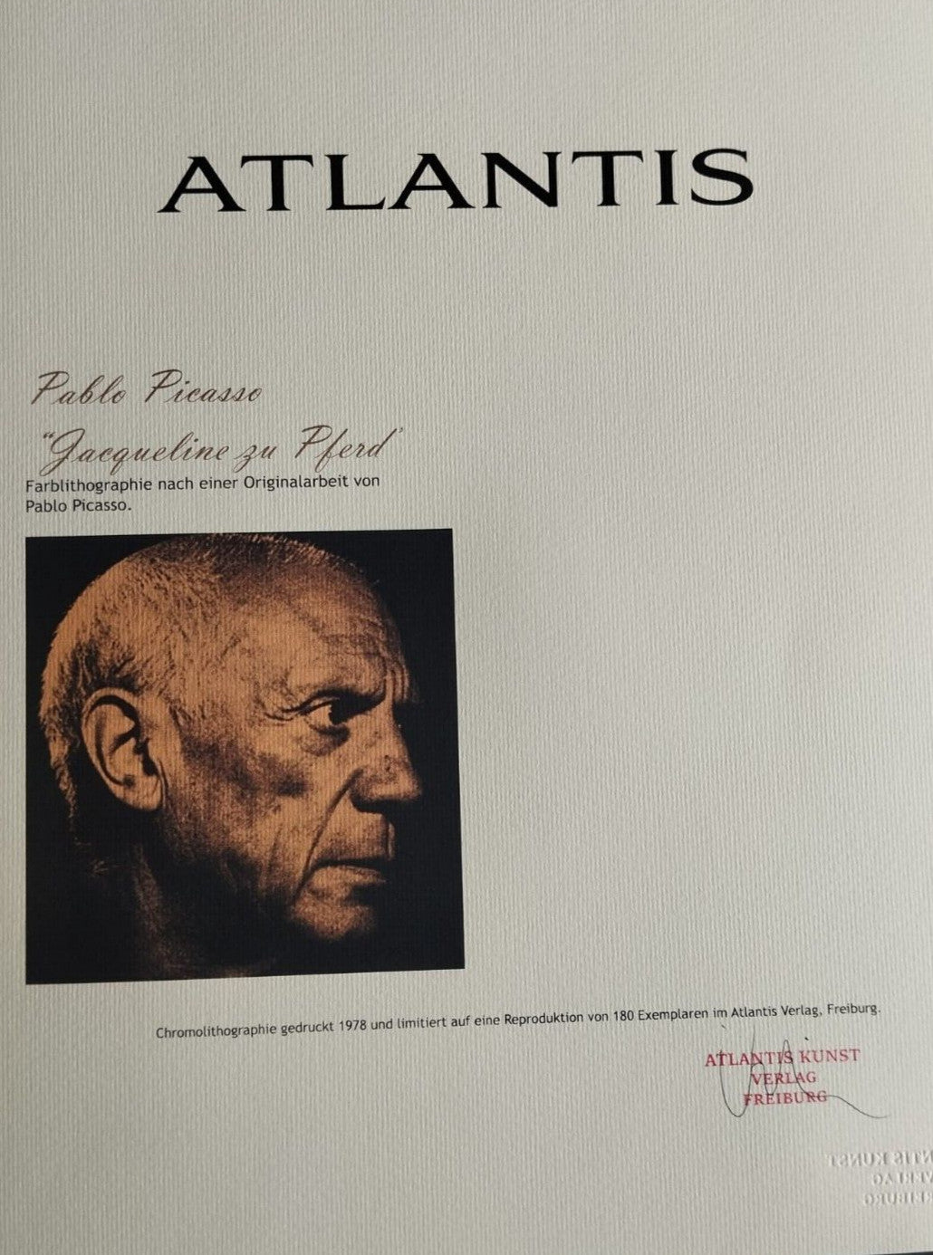 Pablo Picasso Lithograph 180 Ex. Numerated COA Signed Stamped Pablo Picasso " Jacqueline in Plerd " Full sheet printed chromolitography in 1978 In 180 specimens from Atlantis Verlag, Freiburg 30 x 40 cm Signature Pablo Picasso on the slab COA signed in Penna Dry and authentic stamp of the publishing house Atlantis Kunst Verlag Freiburg Pablo Picasso "Jacqueline in Plerd" Full sheet printed chromolitography in 1978In 180 specimens from Atlantis Verlag, Freiburg 30 x 40 cm Signature Pablo Picasso on the slabCOA signed in Penna Dry and authentic stamp of the publishing house Atlantis Kunst Verlag Freiburg