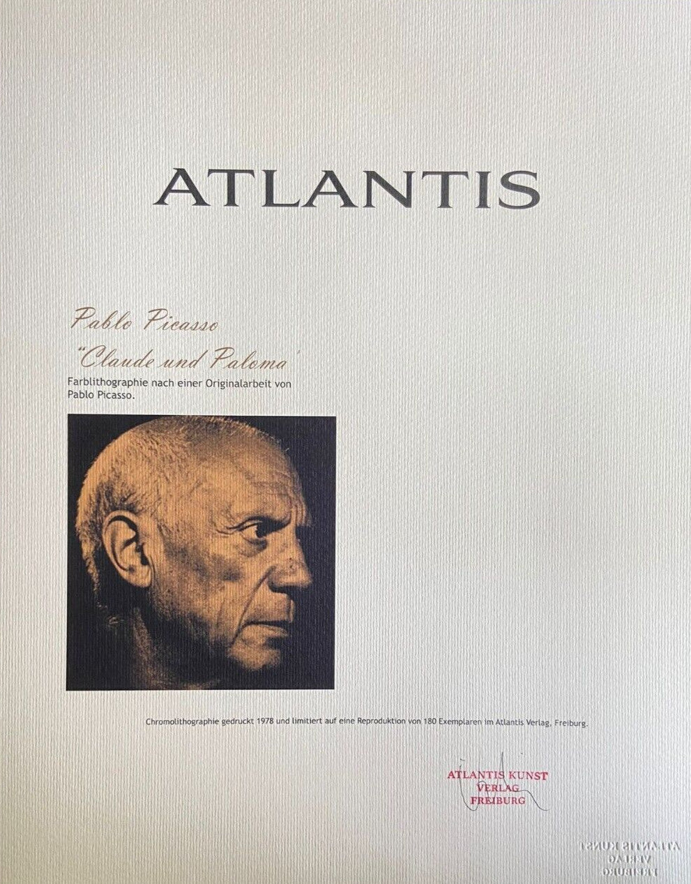 Pablo Picasso " Claude and Paloma " Full sheet printed chromolitography in 1978 In 180 specimens from Atlantis Verlag, Freiburg 32 x 40 cm Signature Pablo Picasso on the slab Dry and authentic stamp of the publishing house Atlantis Kunst Verlag Freiburg Pablo Picasso "Claude and Paloma" Full sheet printed chromolitography in 1978In 180 specimens from Atlantis Verlag, Freiburg 32 x 40 cm Signature Pablo Picasso on the slab Dry and authentic stamp of the publishing house Atlantis Kunst Verlag Freiburg
