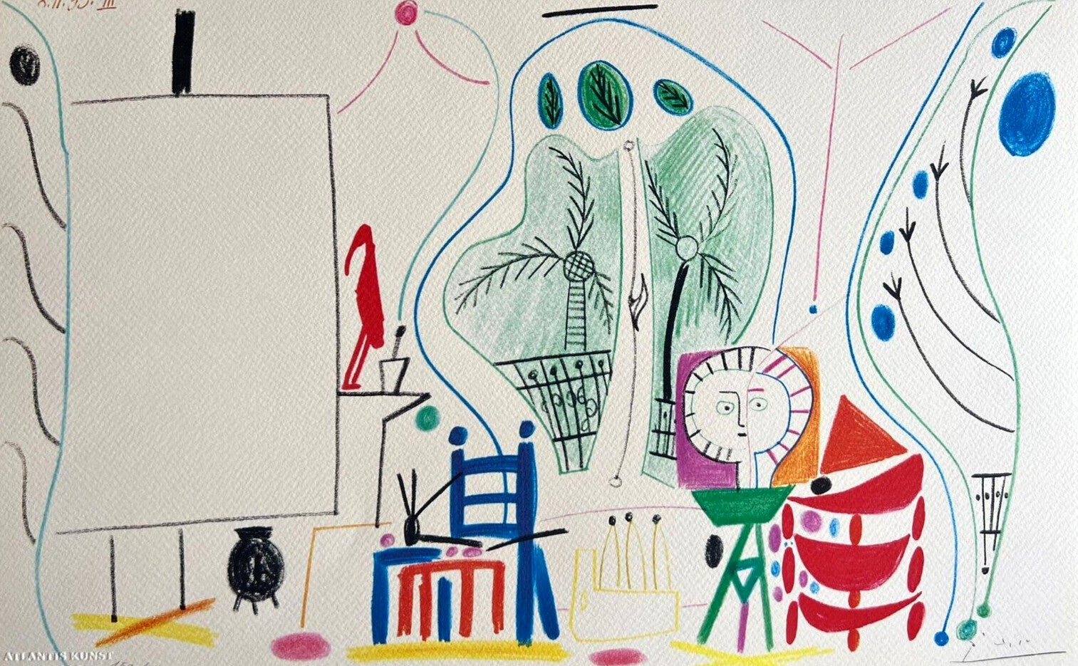 Pablo Picasso Lithograph COA Signed Limited And Numbered Edition In -180 Es- Pablo Picasso "The artist's study " Full sheet printed chromolitography in 1978 In 180 specimens from Atlantis Verlag, Freiburg 30 x 40 cm Signature Pablo Picasso on the slab Dry and authentic stamp of the publishing house Atlantis Kunst Verlag Freiburg Pablo Picasso "The artist's study" Full sheet printed chromolitography in 1978In 180 specimens from Atlantis Verlag, Freiburg 30 x 40 cm Signature Pablo Picasso on the slab Dry and authentic stamp of the publishing house Atlantis Kunst Verlag Freiburg