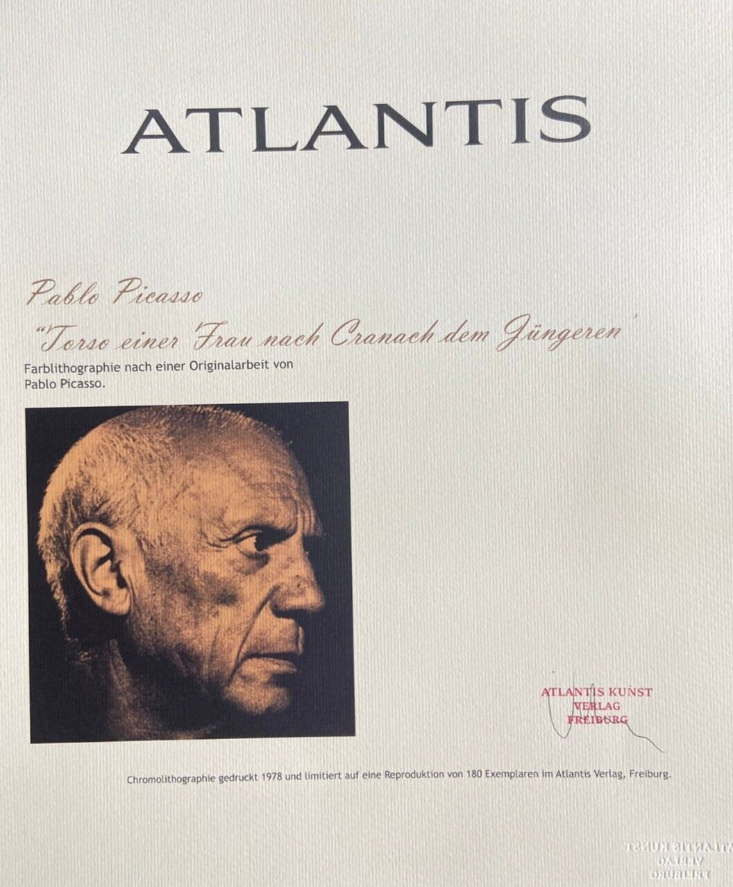 Pablo Picasso Lithograph COA Signed Numbered Certified 180ex Pablo Picasso "Bust by Donna according to Cranach the young man " Chromolithograph printed full sheet in 1978 in 180 copies from Atlantis Verlag, Freiburg 32 x 38 cm Pablo Picasso signature on the plate The progressive number may be different from the one indicated. Dry and authentic stamp of the publishing house Atlantis Kunst Verlag Freiburg Pablo Picasso "Bustby Donna according to Cranach the young man" Chromolithograph printed full sheet in 1978in 180 copies from Atlantis Verlag, Freiburg 32 x 38 cm Pablo Picasso signature on the plate The progressive number may be different from the one indicated. Dry and authentic stamp of the publishing house Atlantis Kunst Verlag Freiburg