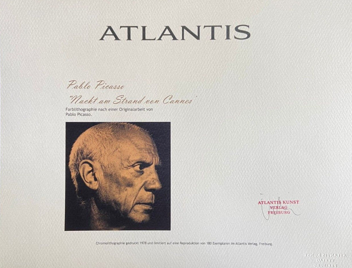 Pablo Picasso Lithograph COA Signed Numbered By Hand In Pencil Pablo Picasso " Naked on the Cannes beach " Full sheet printed chromolitography in 1978 In 180 specimens from Atlantis Verlag, Freiburg 32 x 40 cm Signature Pablo Picasso on the slab - COA signed in Penna Dry and authentic stamp of the publishing house Atlantis Kunst Verlag Freiburg Pablo Picasso "Naked on the Cannes beach" Full sheet printed chromolitography in 1978In 180 specimens from Atlantis Verlag, Freiburg 32 x 40 cm Signature Pablo Picasso on the slab -COA signed in Penna Dry and authentic stamp of the publishing house Atlantis Kunst Verlag Freiburg
