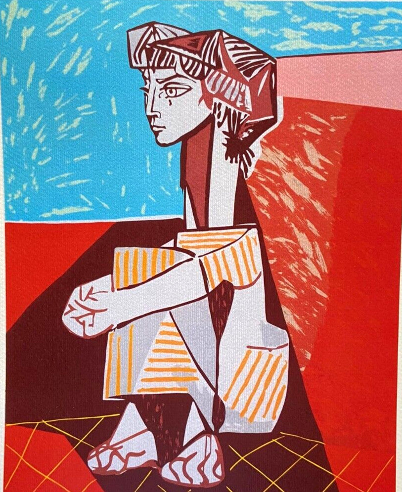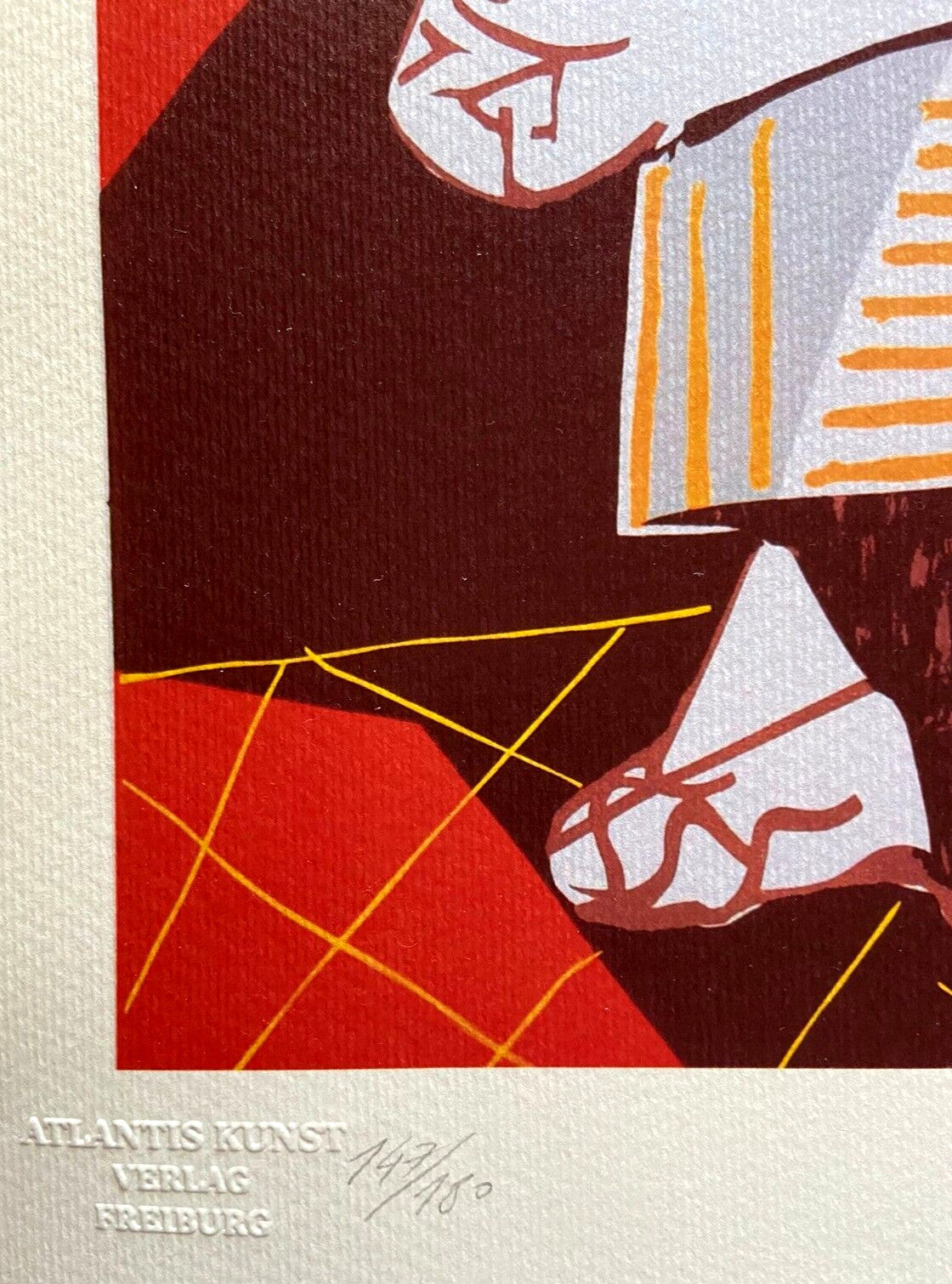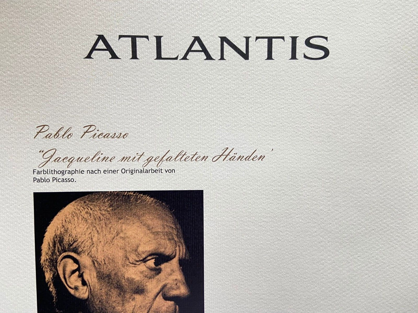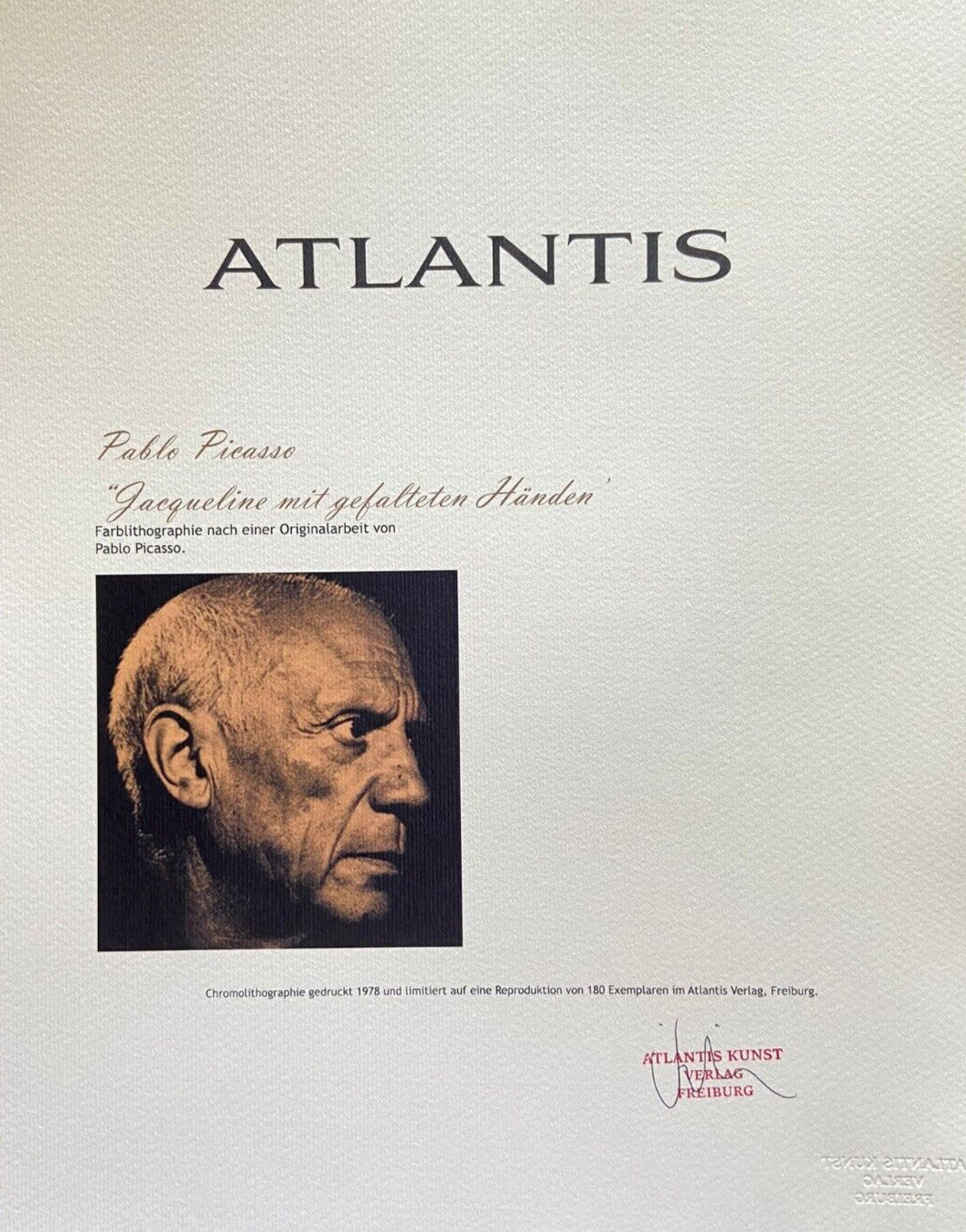Pablo Picasso Lithograph COA Signed Numbered By Hand Certified 180 Es. Pablo Picasso " Jacqueline with his hands on the " Full sheet printed chromolitography in 1978 In 180 specimens from Atlantis Verlag, Freiburg 32 x 41 cm Signature Pablo Picasso on the slab Dry and authentic stamp of the publishing house Atlantis Kunst Verlag Freiburg Pablo Picasso "Jacqueline with his hands on the" Full sheet printed chromolitography in 1978In 180 specimens from Atlantis Verlag, Freiburg 32 x 41 cm Signature Pablo Picasso on the slab Dry and authentic stamp of the publishing house Atlantis Kunst Verlag Freiburg
