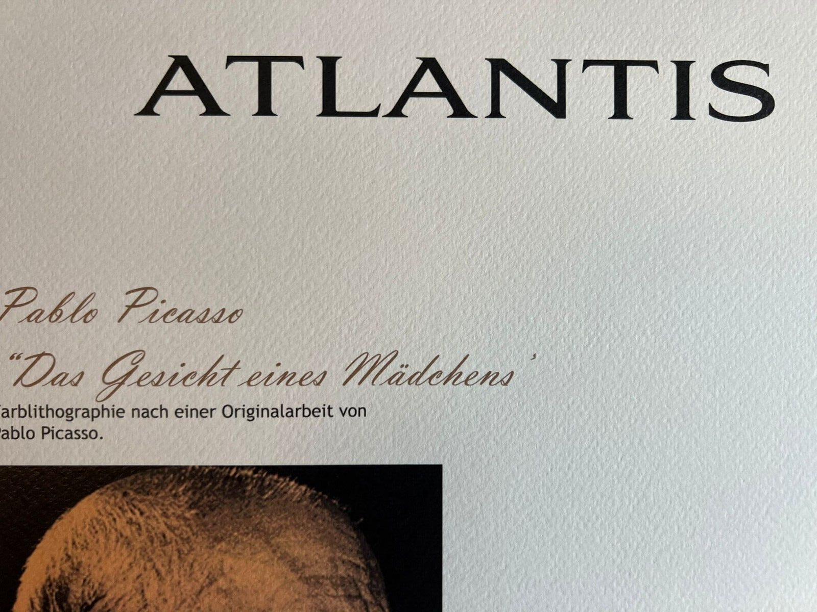 Pablo Picasso Lithograph COA Signed Numbered Limited 180@ Pablo Picasso " The face of a girl " Chromolithograph printed full sheet in 1978 in 180 copies from Atlantis Verlag, Freiburg 32 x 40 cm Pablo Picasso signature on the plate COA signed in Penna Dry and authentic stamp of the publishing house Atlantis Kunst Verlag Freiburg Pablo Picasso "The face of a girl" Chromolithograph printed full sheet in 1978in 180 copies from Atlantis Verlag, Freiburg 32 x 40 cm Pablo Picasso signature on the plateCOA signed in Penna Dry and authentic stamp of the publishing house Atlantis Kunst Verlag Freiburg