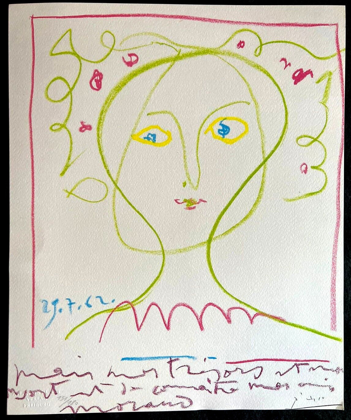 Pablo Picasso Lithograph COA Signed Numbered Limited 180@ Pablo Picasso " The face of a girl " Chromolithograph printed full sheet in 1978 in 180 copies from Atlantis Verlag, Freiburg 32 x 40 cm Pablo Picasso signature on the plate COA signed in Penna Dry and authentic stamp of the publishing house Atlantis Kunst Verlag Freiburg Pablo Picasso "The face of a girl" Chromolithograph printed full sheet in 1978in 180 copies from Atlantis Verlag, Freiburg 32 x 40 cm Pab......