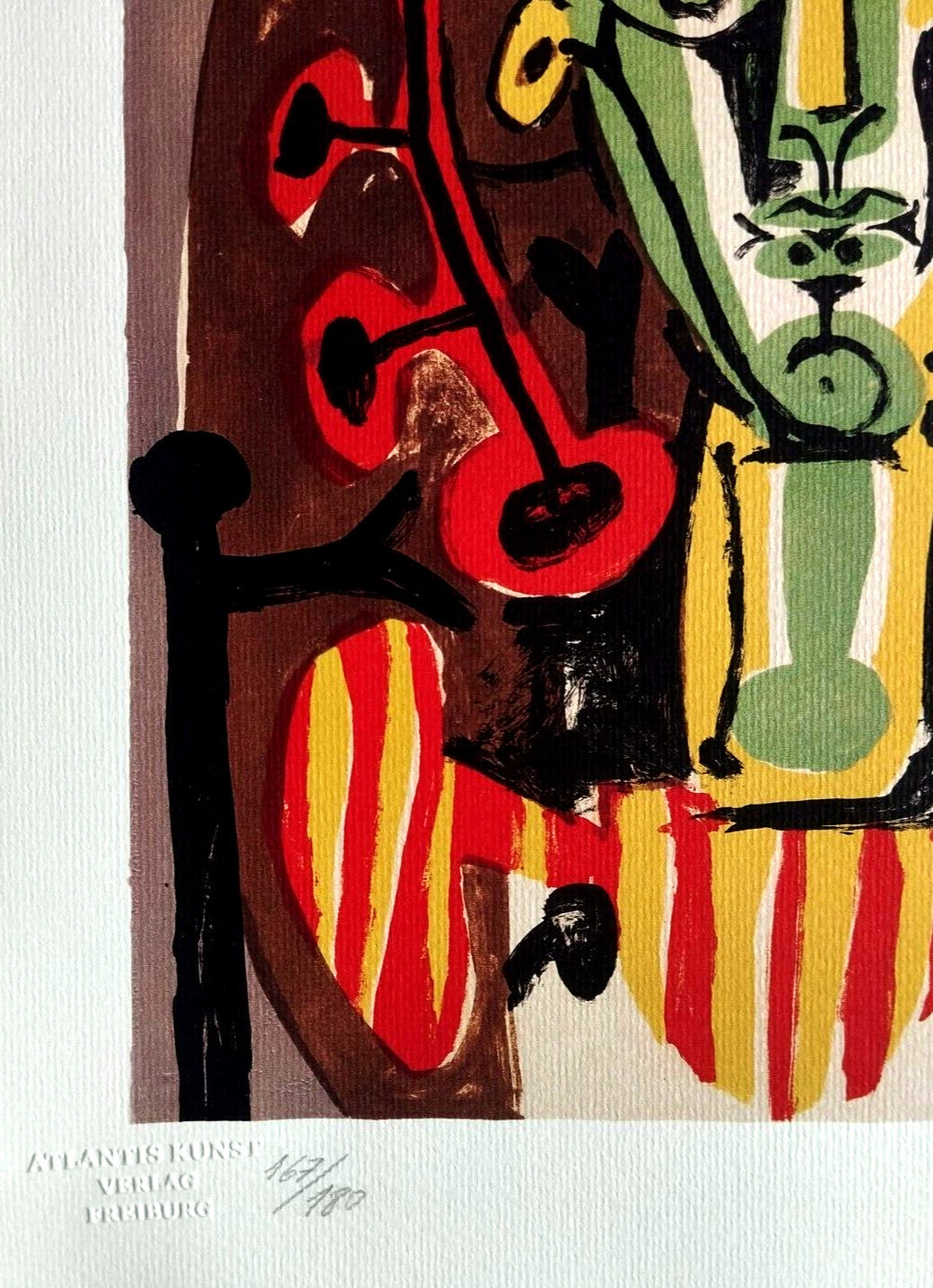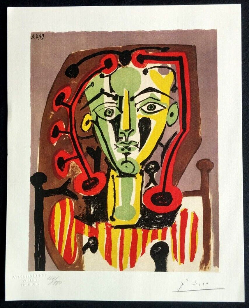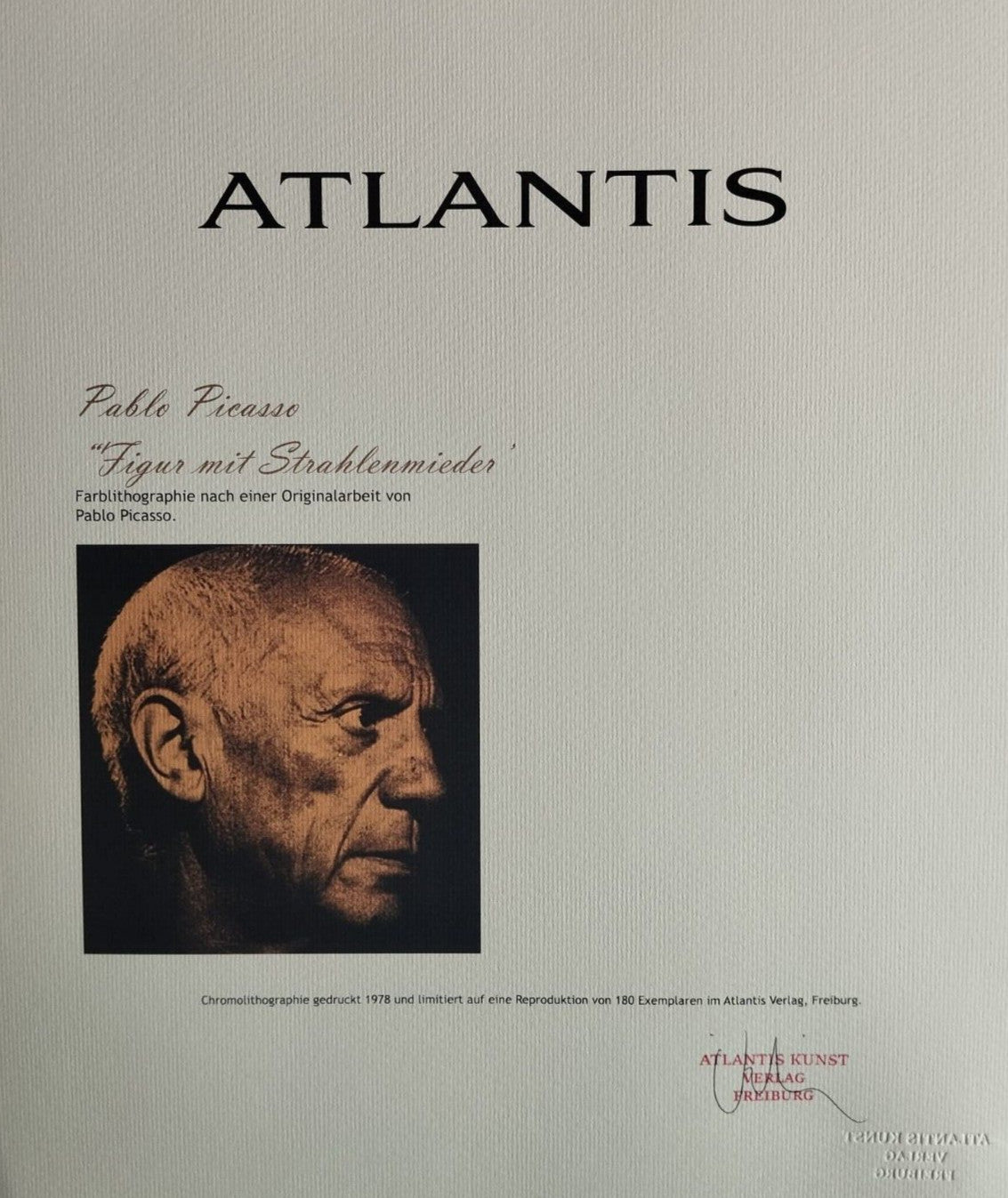 Pablo Picasso Figure with rays bodice " Full sheet printed chromolitography in 1978 In 180 specimens from Atlantis Verlag, Freiburg 32 x 40 cm Signature Pablo Picasso on the slab COA signed in Penna The progressive number could be different from the one indicated. Dry and authentic stamp of the publishing house Atlantis Kunst Verlag Freiburg Pablo Picasso Figure with rays bodice" Full sheet printed chromolitography in 1978In 180 specimens from Atlantis Verlag, Freiburg 32 x 40 cm Signature Pablo Picasso on the slabCOA signed in Penna The progressive number could be different from the one indicated. Dry and authentic stamp of the publishing house Atlantis Kunst Verlag Freiburg