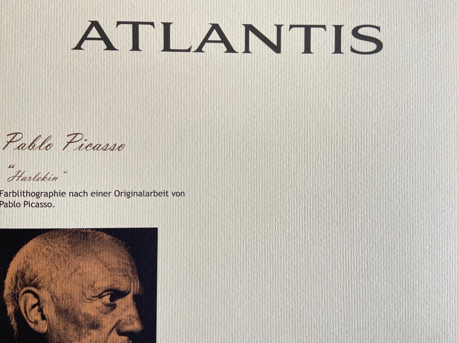 Pablo Picasso Lithograph Coa Signed Numbered Hand Stamped 180 Pablo Picasso "TO rlecchino " Chromolithography printed in 1978 In 180 specimens from Atlantis Verlag, Freiburg 30 x 40 cm Signature Pablo Picasso on the slab - COA signed in Penna Dry and authentic stamp of the publishing house Atlantis Kunst Verlag Freiburg Pablo Picasso "TOrlecchino" Chromolithography printed in 1978In 180 specimens from Atlantis Verlag, Freiburg 30 x 40 cm Signature Pablo Picasso on......