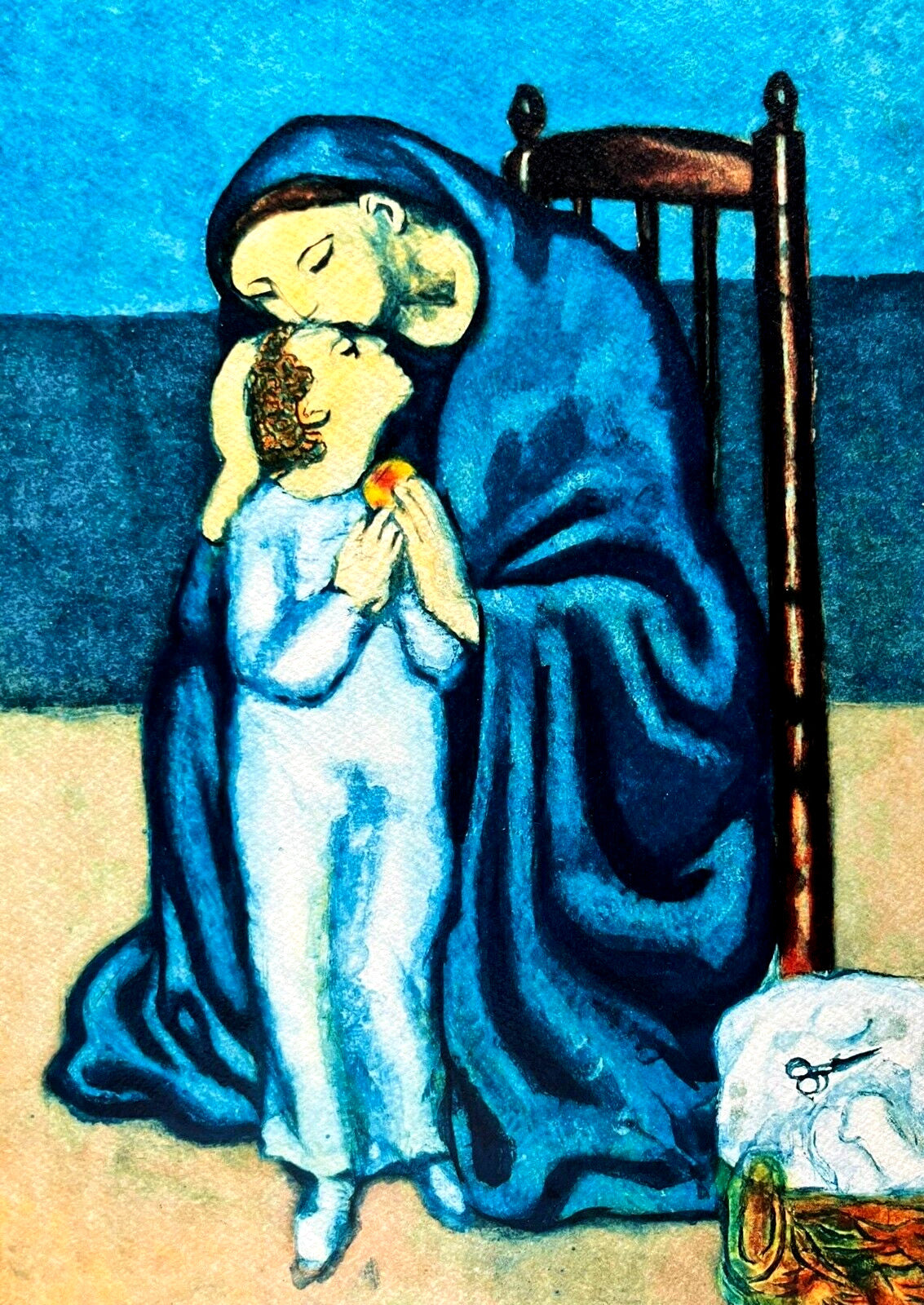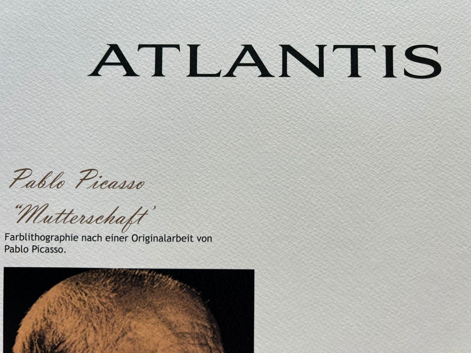 Pablo Picasso Lithograph Signed COA (Pencil Numbered Stamped) Pablo Picasso " Maternity " Chromolithograph printed full sheet in 1978 in 180 copies from Atlantis Verlag, Freiburg 30 x 43 cm Pablo Picasso signature on the plate COA signed in Penna The progressive number may be different from the one indicated. Dry and authentic stamp of the publishing house Atlantis Kunst Verlag Freiburg Pablo Picasso "Maternity" Chromolithograph printed full sheet in 1978in 180 copies from Atlantis Verlag, Freiburg 30 x 43 cm Pablo Picasso signature on the plateCOA signed in Penna The progressive number may be different from the one indicated. Dry and authentic stamp of the publishing house Atlantis Kunst Verlag Freiburg