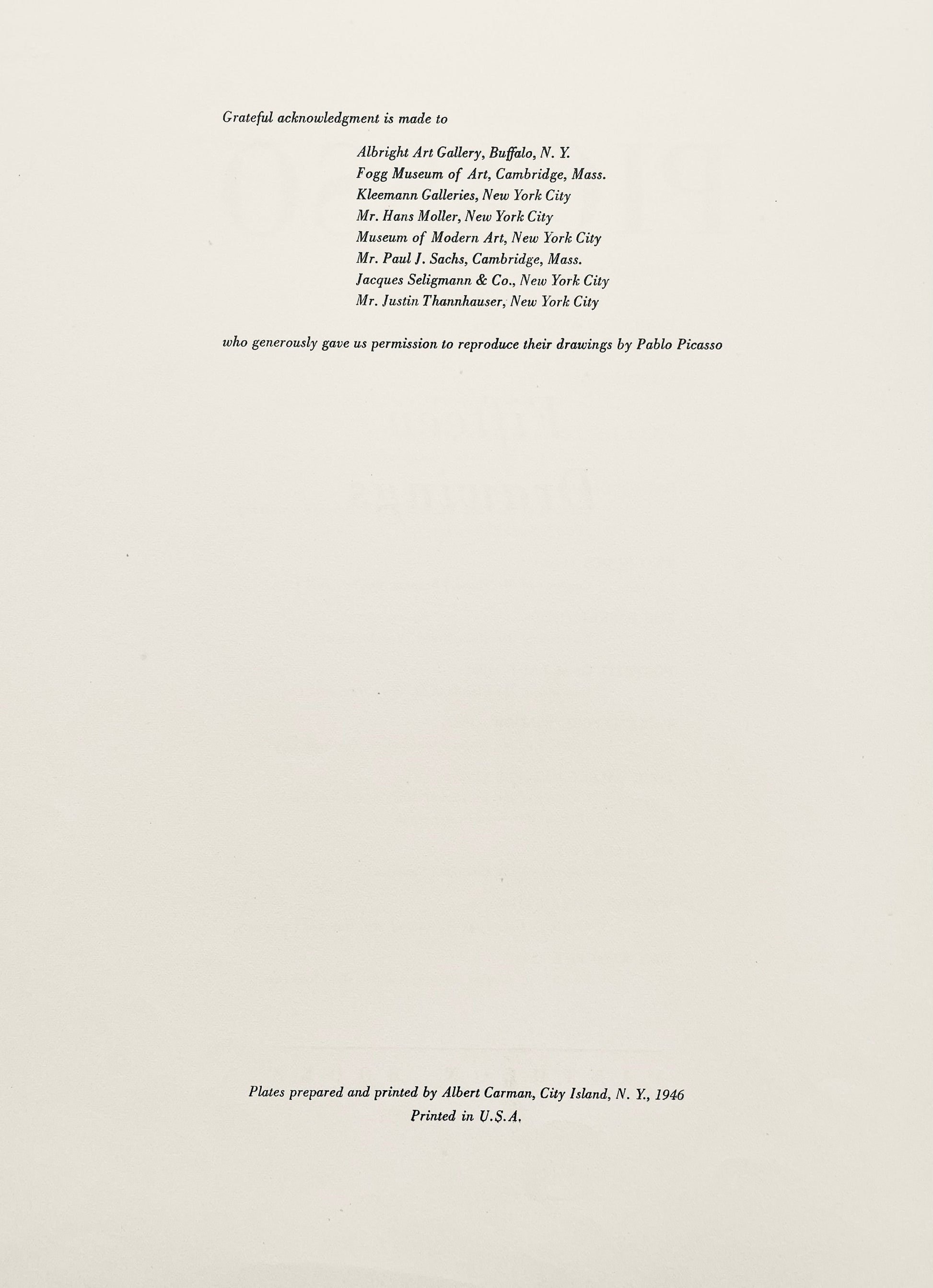 Lithograph and stencil on vlin paper. Unsigned and unnumbered, as issued. Paper Size: 18.75 x 12.625 inches. Excellent condition. Notes: From the folio, Picasso: Fifteen Drawings, 1946. Published by Pantheon Books, Inc., New York; rendered and printed by Albert Carman, City Island, New York, 1946 in an edition of D.