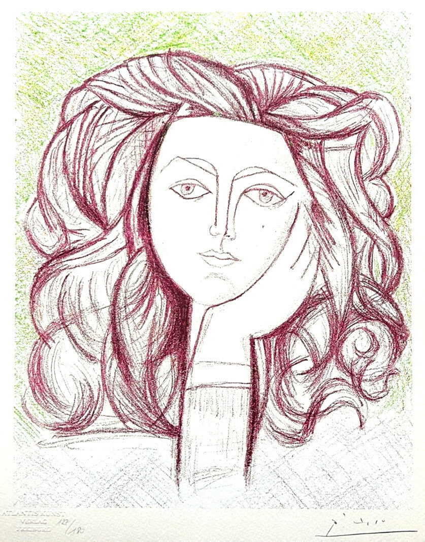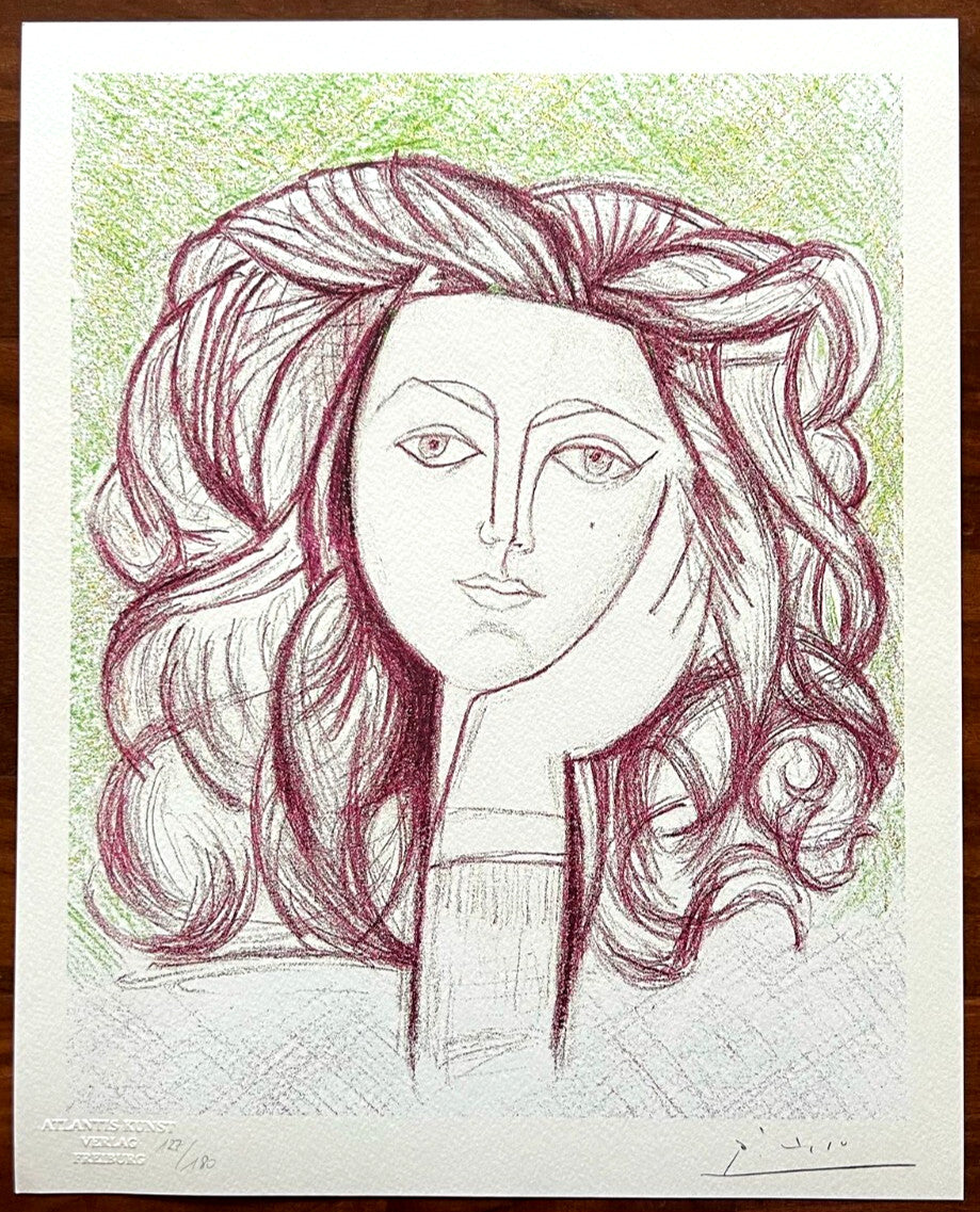 Pablo Picasso - Signed Lithograph COA - Hand Numbered [In 180 Ex] Pablo Picasso " Portrait of Francoise " Full sheet printed chromolitography in 1978 In 180 specimens from Atlantis Verlag, Freiburg 32 x 40 cm Signature Pablo Picasso on the slab - COA signed in Penna Dry and authentic stamp of the publishing house Atlantis Kunst Verlag Freiburg Pablo Picasso "Portrait of Francoise" Full sheet printed chromolitography in 1978In 180 specimens from Atlantis Verlag, Freiburg 32 x 40 cm Signature Pablo Picasso on the slab-COA signed in Penna Dry and authentic stamp of the publishing house Atlantis Kunst Verlag Freiburg
