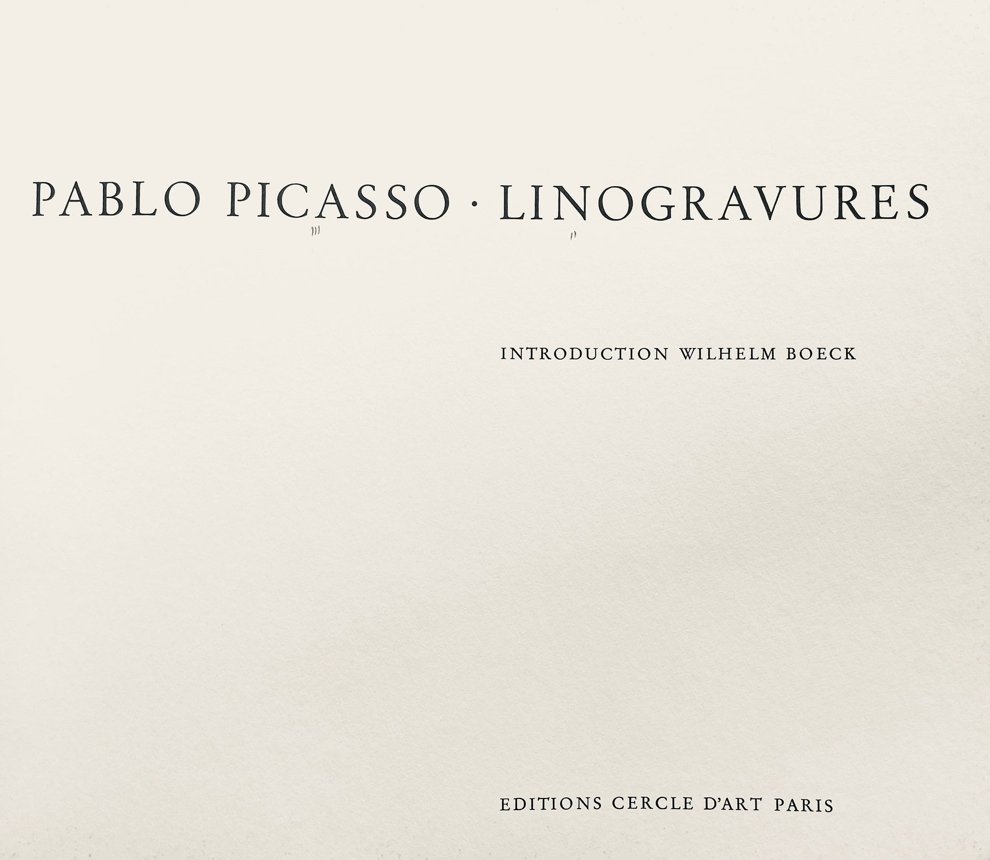 Linocut on vlin paper. Unsigned and unnumbered, as issued. Paper Size: 12 x 14 inches. Excellent condition. Notes: From the album, Pablo Picasso: Grabados al linleo. Published by Gustavo Gili, S.A., Barcelona, and France ditions Cercle d'Art, Paris; printed by Verlag Gerd Hatje, Stuttgart, 1962. Excerpted from the volume (translated from Spanish), This limited edition of the album "Pablo Picasso, engraved in linocut", appeared for release in February 1963, consists of DXX numbered examples from I to DXX. The publisher thanks the Galerie Louise Leiris, of Paris, for the transfer of the originals for printing. 1962 by Verlag Hatje, Stuttgart. Reproduction rights reserved by S. P. A. D. E. M., Paris, and Cosmopress Geneva. No. Registration B. 885. - 1962; Legal deposit B. 29.632. - 1962. Typography printed by the Sociedad Alianza de Artes Grficas (S. A. D. A, G.), Roselln, 298-300, Barcelona.