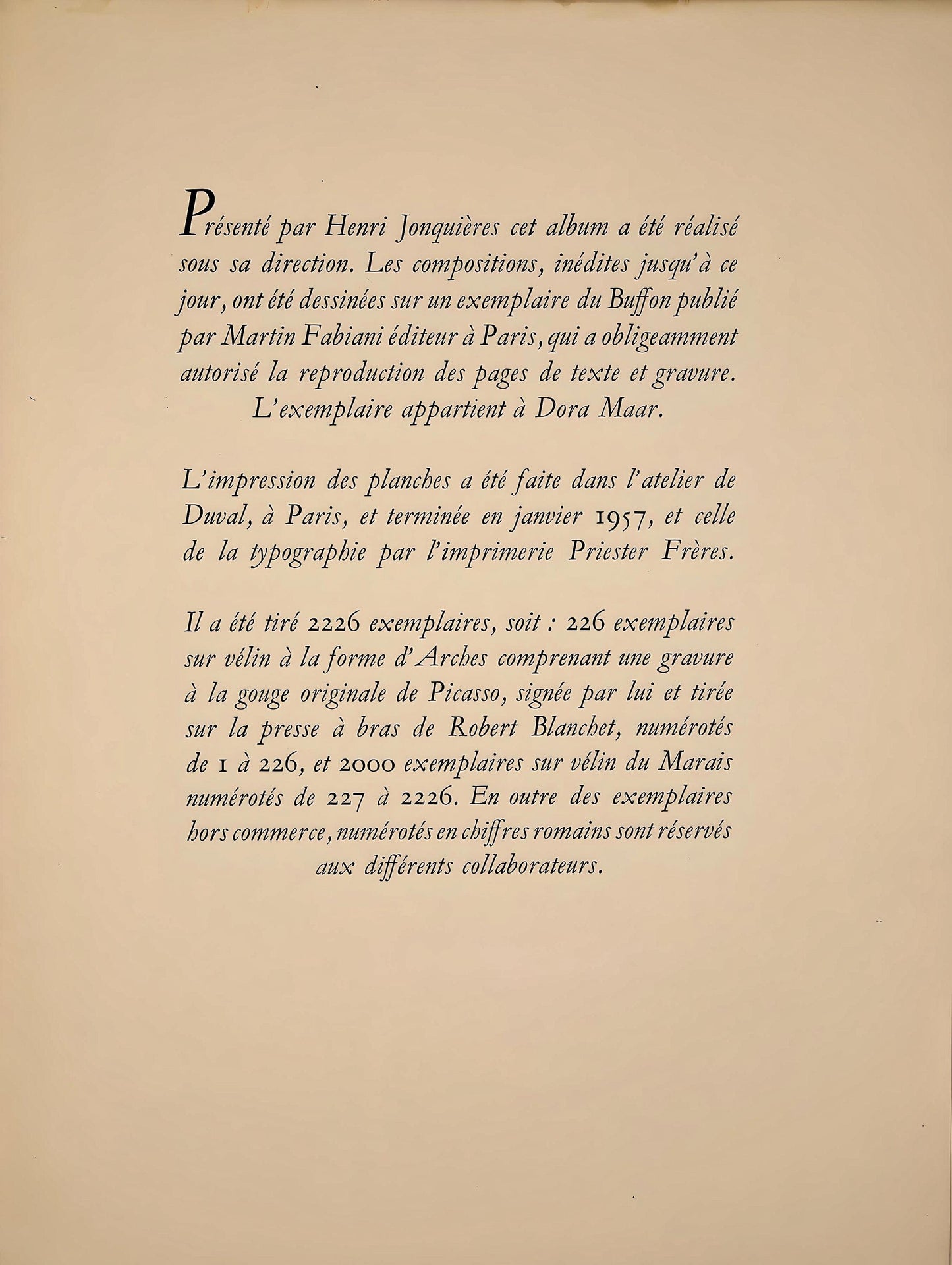 Lithograph on vlin du Marais paper. Paper Size: 14.5 x 11 inches. Excellent condition. Inscription: Unsigned and unnumbered, as issued. Notes: From the folio, 40 dessins de Picasso en marge du Buffon, 1957. Published by Henri Jonquires, diteur, Paris, with the authorization of Martin Fabiani, diteur, Paris, in collaboration with Dora Maar, Paris; printed by l'atelier de Duval, Paris, January, 1957. Excerpted from the folio (translated from French), Presented by Henri Jonquires, the album was made under his direction. The compositions, unpublished to date, were drawn on an example of the Buffon published by Martin Fabiani publisher in Paris, who obliged to authorize the reproduction of the pages of text and engraving. The example belongs to Dora Maar. The printing of the plates was done in l'atelier de Duval, Paris, and completed in January 1957, and that of the typography by the l'imprimerie Priester Frres. It was printed MMCCXXVI examples, or: CCXXVI examples on sur vlin la forme d'Arches including an engraving with the by the hand of Picasso, signed by him and printed on Robert Blanchet's press, numbered from I to CCXXVI, and MM examples on vlin du Marais numbered from CCXXVII to MMCCXXVI. In addition, hors commerce examples, numbered in Roman numerals, are reserved for the various collaborators.