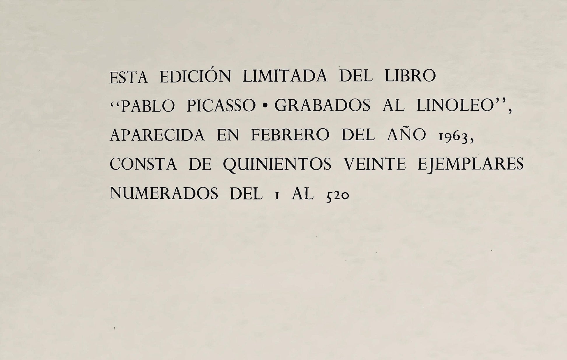 Linocut on vlin paper. Unsigned and unnumbered, as issued. Size: 12 x 14 inches. Excellent condition. Notes: From the album, Pablo Picasso: Grabados al linleo. Published by Gustavo Gili, S.A., Barcelona, and France ditions Cercle d'Art, Paris; printed by Verlag Gerd Hatje, Stuttgart, 1962. Excerpted from the volume (translated from Spanish), This limited edition of the album "Pablo Picasso, engraved in linocut", appeared for release in February 1963, consists of DXX numbered examples from I to DXX. The publisher thanks the Galerie Louise Leiris, of Paris, for the transfer of the originals for printing. 1962 by Verlag Hatje, Stuttgart. Reproduction rights reserved by S. P. A. D. E. M., Paris, and Cosmopress Geneva. No. Registration B. 885. - 1962; Legal deposit B. 29.632. - 1962. Typography printed by the Sociedad Alianza de Artes Grficas (S. A. D. A, G.), Roselln, 298-300, Barcelona.