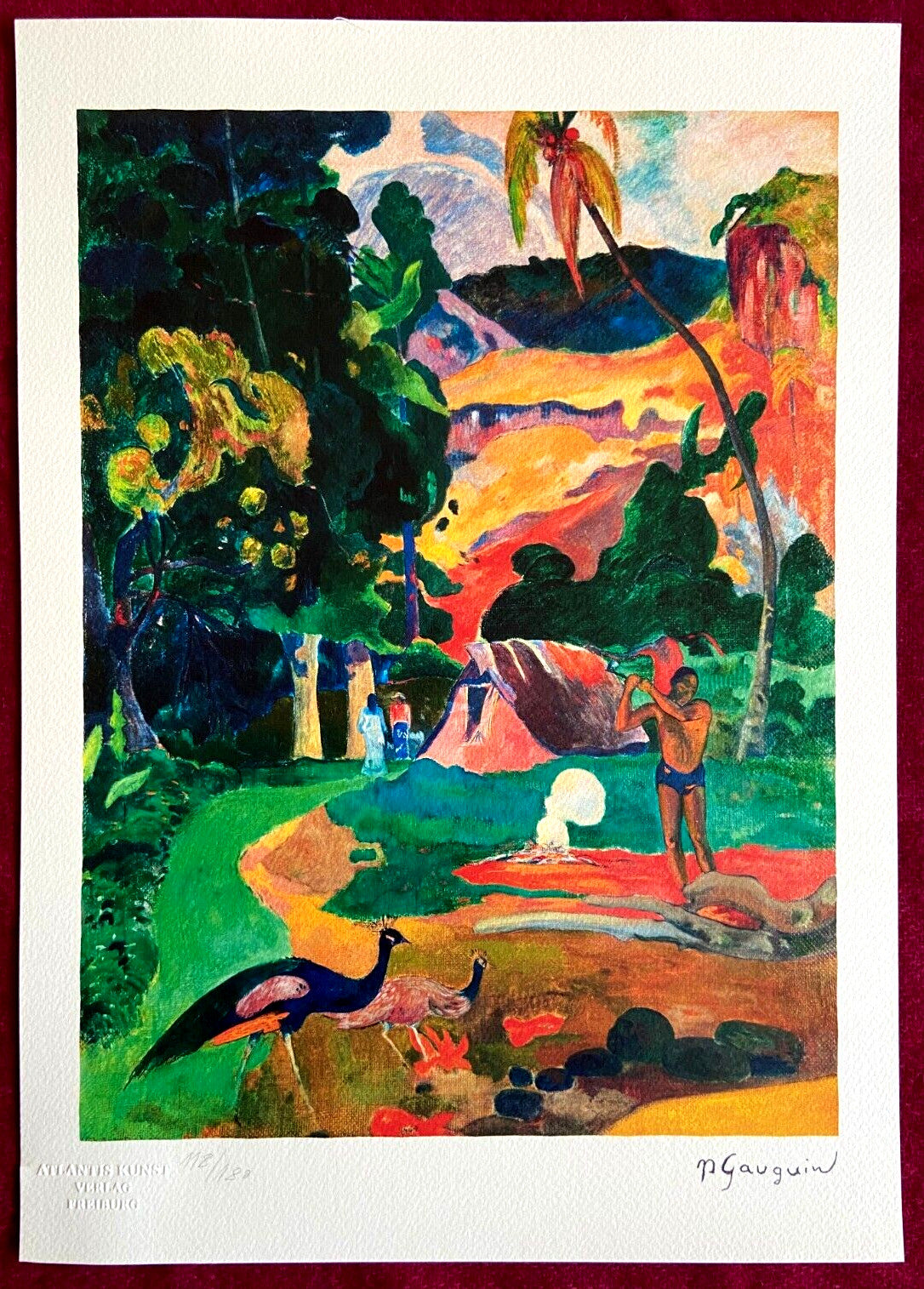 Paul Gauguin "P landscape with peacocks " Chromolithograph printed in 1978 in 180 copies by Atlantis Verlag, Freiburg 30 x 42 cm Signature Paul Gauguin on the plate Embossed stamp and authentication by the publishing house Atlantis Kunst Verlag Freiburg Paul Gauguin "Plandscape with peacocks" Chromolithograph printed in 1978 in 180 copies by Atlantis Verlag, Freiburg 30 x 42 cm Signature Paul Gauguin on the plate Embossed stamp and authentication by the publishing house Atlantis Kunst Verlag Freiburg