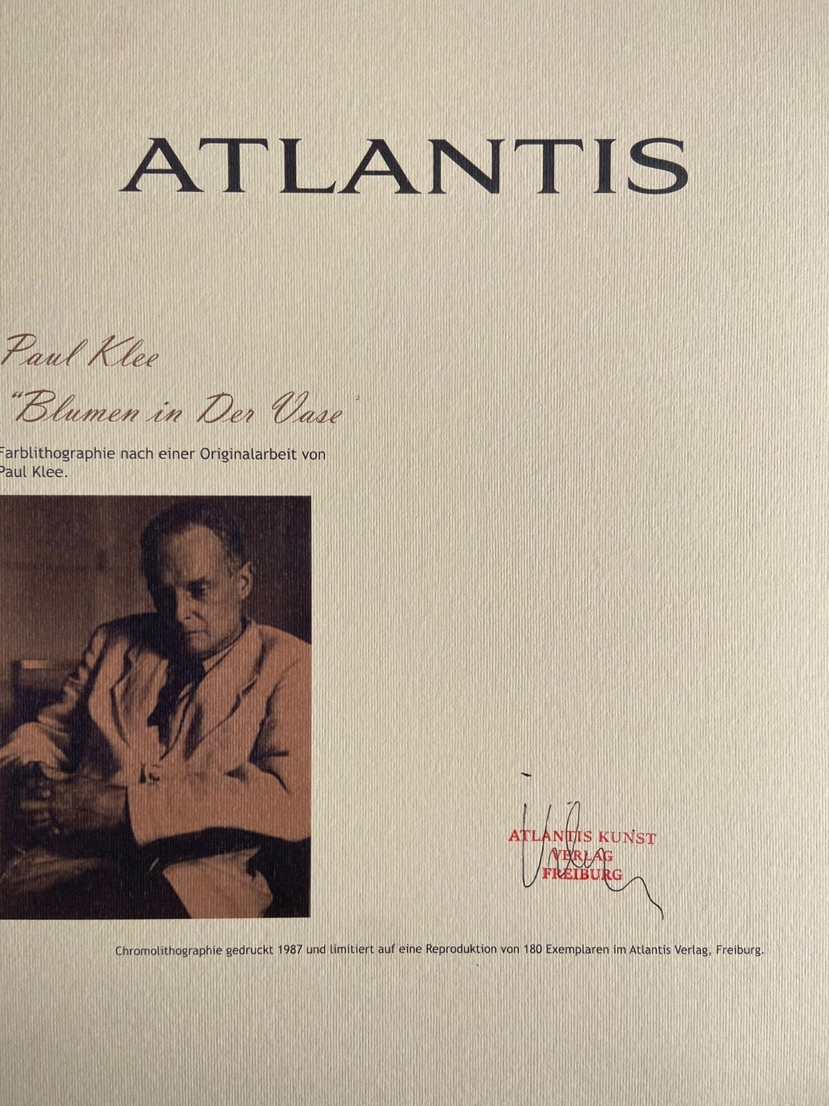 Paul Klee "Vase flowers " Chromolithography printed in 1987 in 180 specimens by Atlantis Verlag, Freiburg 30 x 39 cm Signs Paul Klee on the slab Dry and authentic stamp of the publishing house The progressive number could be different from the published one. Atlantis Kunst Verlag Freiburg Paul Klee "Vase flowers" Chromolithography printed in 1987 in 180 specimens by Atlantis Verlag, Freiburg 30 x 39 cm Signs Paul Klee on the slab Dry and authentic stamp of the publishing house The progressive number could be different from the published one. Atlantis Kunst Verlag Freiburg