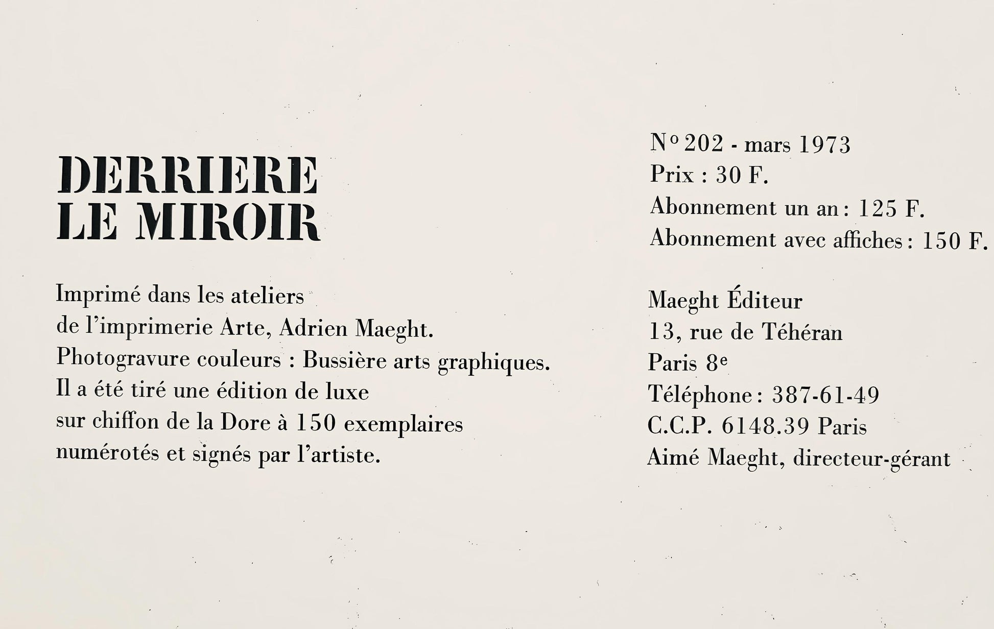 Published by Aim Maeght, diteur, Paris; printed by ditions Pierre Feu, Galerie Maeght, Paris.