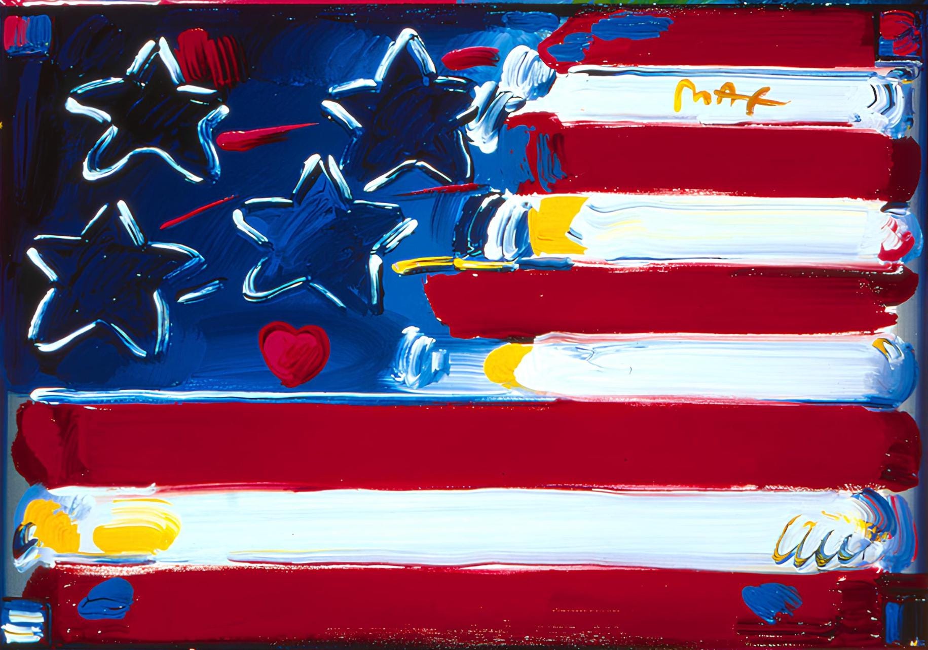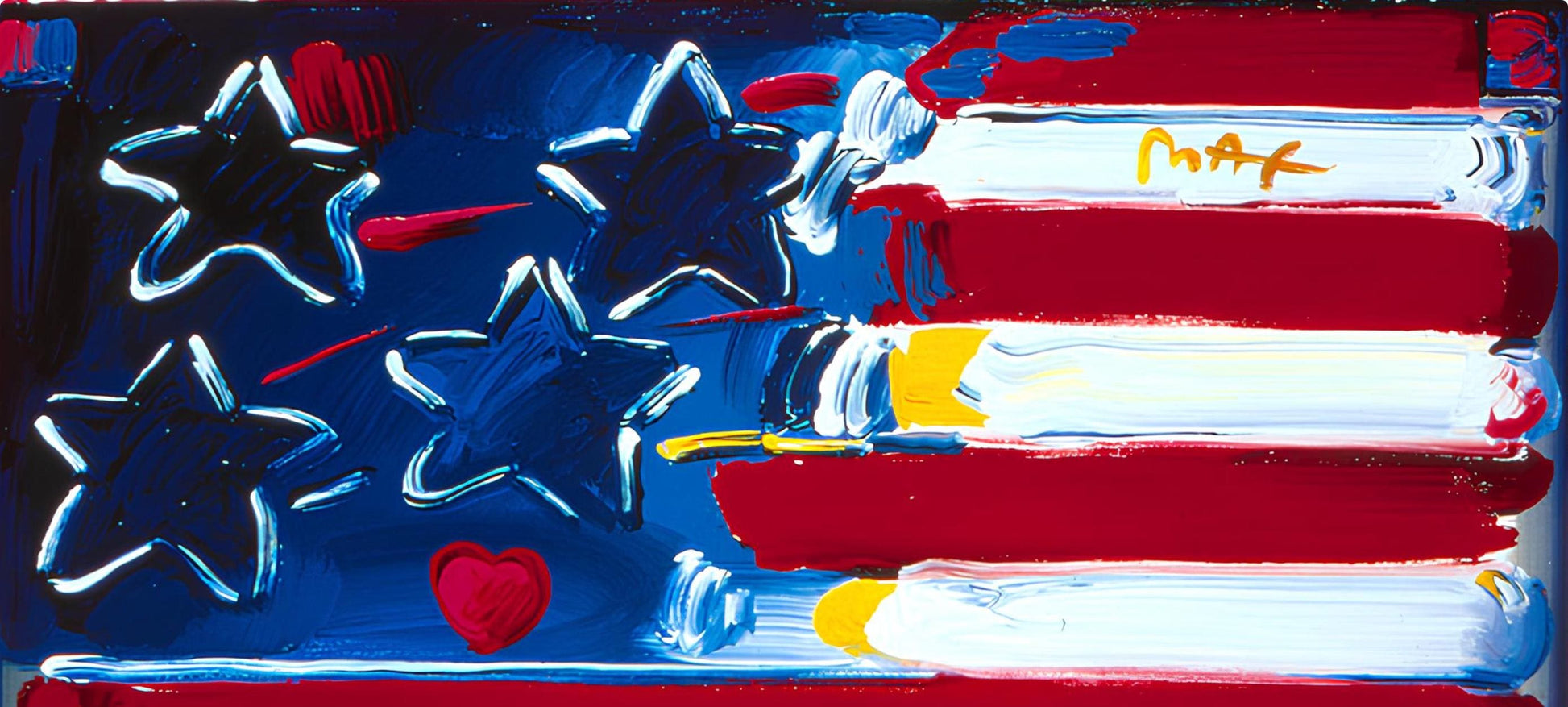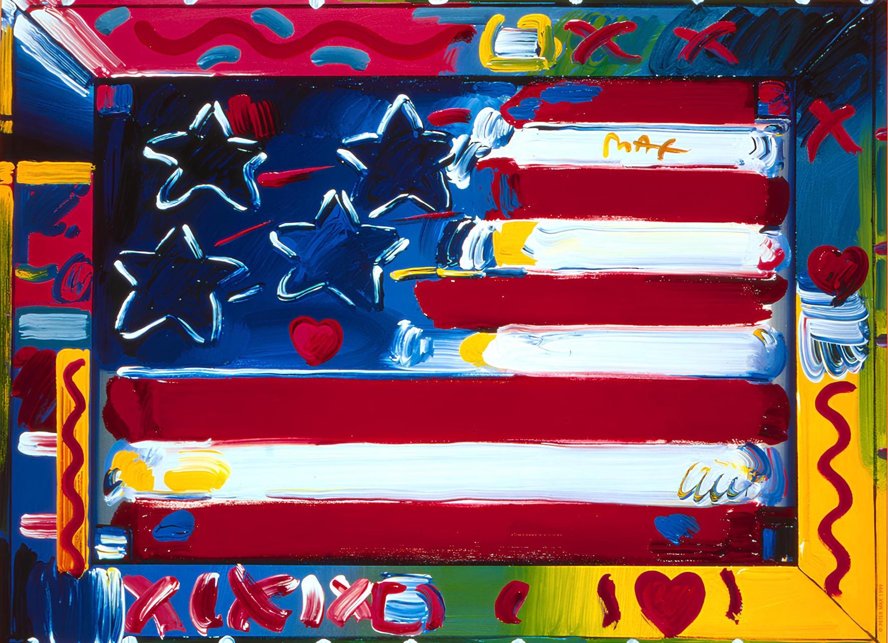 Offset lithograph in colors on gloss archival paper. Paper size: 24 x 36 inches. Excellent condition. Inscription: Hand signed by Peter Max in ink and unnumbered, as issued. Notes: Published and printed by Via Max, Inc., New York, 1999. Policy: We officially represent the Peter Max Studio (ALP, Inc., New York), and this artwork will be shipped directly from the Studio to the buyer. Per the requirements of the Peter Max family and the Studio (ALP, Inc., New York), this artwork will be dedicated by the Peter Max Studio to the buyer or a person of the buyers choosing (first and last name). Excerpted from the Peter Max Archives, Peter Max fell in love with America as a child growing up in Shanghai, through American Jazz radio, comic books, Hollywood movies and Life Magazine covers. He immigrated to the states as a teenager with his parents and made New York City and America his home. In 'Flag with Heart On Blends,' the artist honors the innovative and freedom-loving spirit of America and its people - 'a country with a heart,' he says. Max adds love to his expressionistic interpretation of 'Old Glory' with a red heart in the field of stars. This artwork brilliantly reproduces the artist's bold color, kinetic 'zoople' border brush detailing and features a Max full Statue of Liberty painting in the margin - all honoring the country that Max loves.