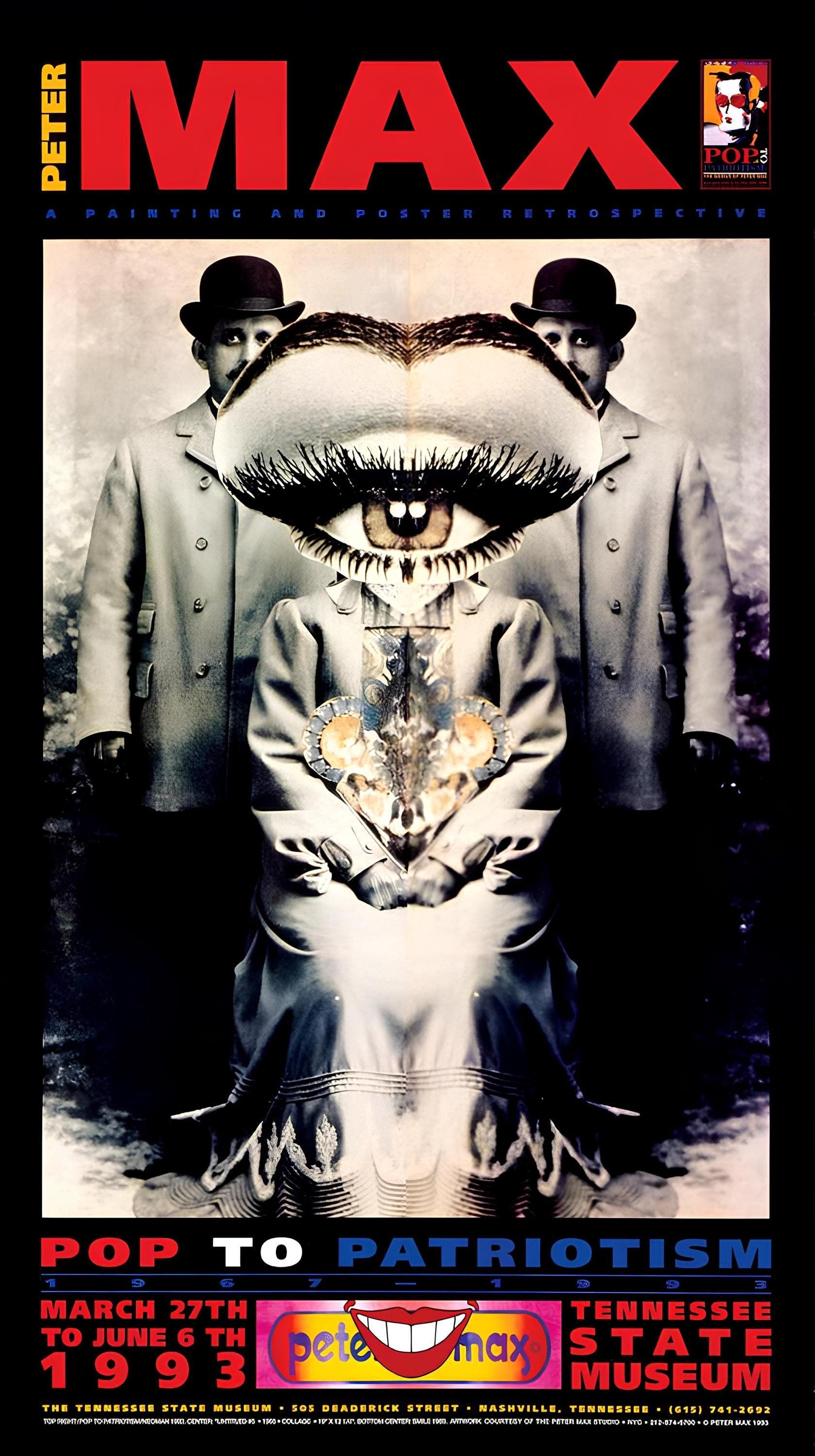 Offset lithograph in colors on gloss archival paper. Paper size: 36 x 20 inches. Excellent condition. Inscription: Hand signed by Peter Max in ink and unnumbered, as issued. Notes: Published and printed by Via Max, Inc., New York, 1993. Policy: We officially represent the Peter Max Studio (ALP, Inc., New York), and this artwork will be shipped directly from the Studio to the buyer. Per the requirements of the Peter Max family and the Studio (ALP, Inc., New York), this artwork will be dedicated by the Peter Max Studio to the buyer or a person of the buyers choosing (first and last name). Excerpted from the Peter Max Archives, This vintage museum exhibition artwork features one of Peter Max's mesmerizing collages from his 'psychedelic surrealism' period of the mid-1960s. During this period Max worked with historic photographs, mixing them with avant-garde fashion photographs, printed patterns and textures. Max meticulously cut the elements to form surreal and mirrored imagery, and enhanced the designs with high-contrast photostat experimentation. This artwork brilliantly reproduces the graphic power and visual illusion of this collage work and commemorates Max's 'Pop to Patriotism' retrospective - one of many one-man museum exhibitions throughout his career of over a half-century.