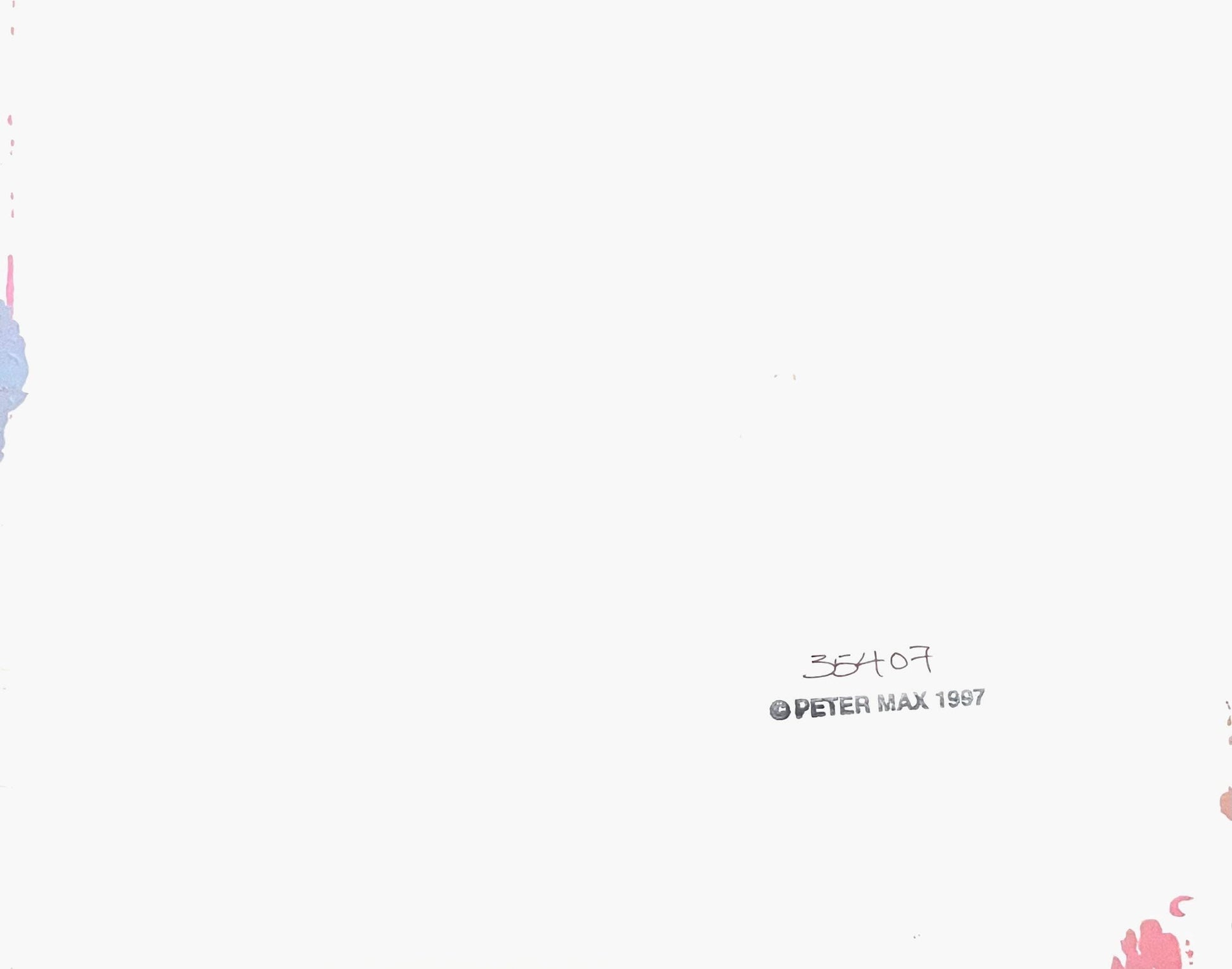 Acrylic and lithograph on vlin dArches paper. Paper size: 8.5 x 10.5 inches. Excellent condition. Inscription: Hand signed in ink, as issued. Notes: Published, printed by Via Max, New York; painted by Peter Max, New York, 1997.