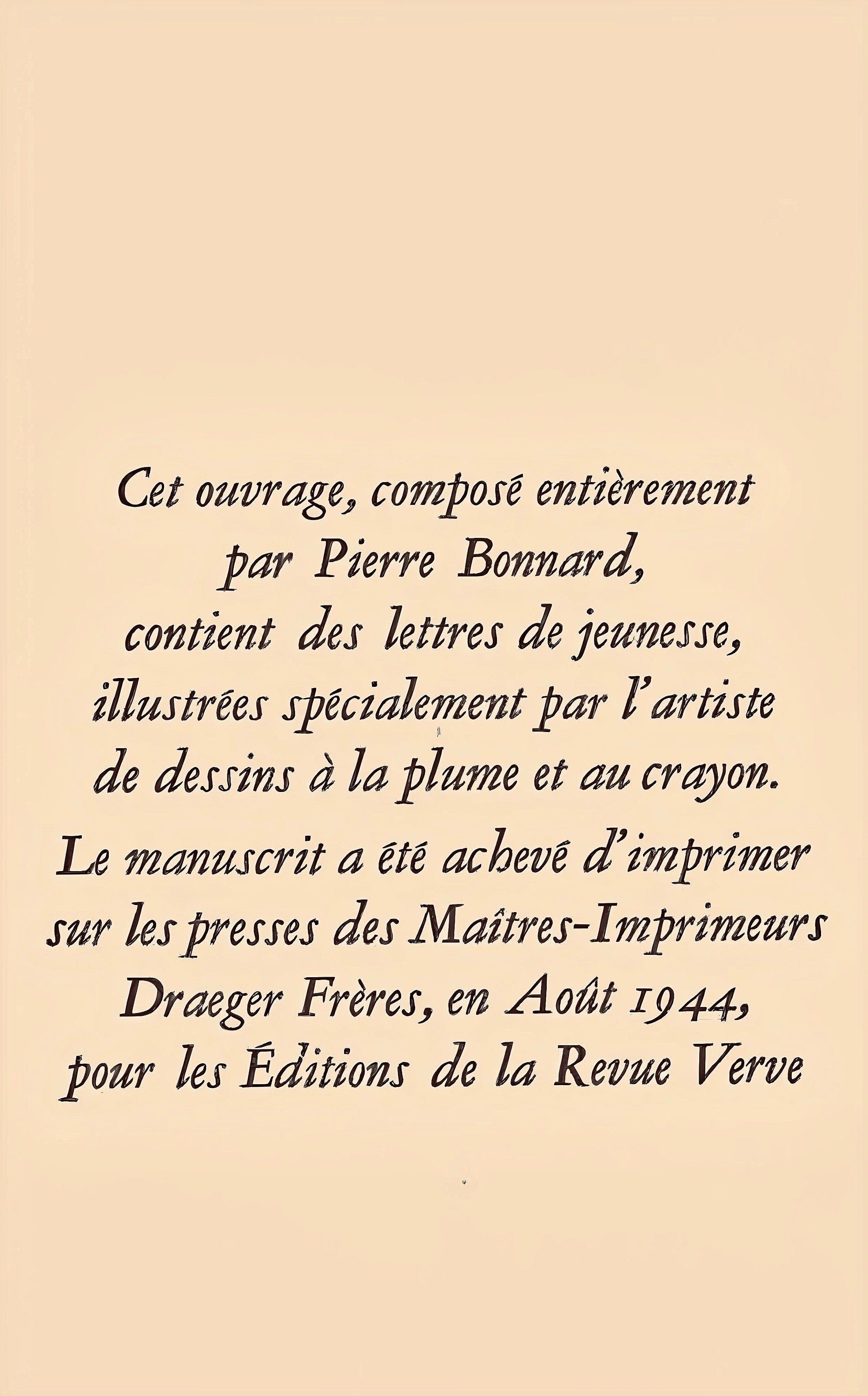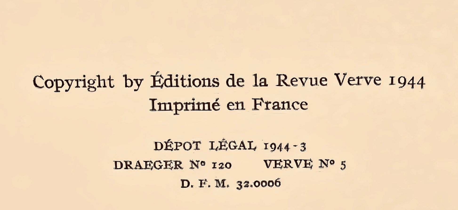 Published by ditions de la Revue Verve, Paris; under the direction of Triade, diteur, Paris; printed by Draeger Frres, Paris, August 1944.
