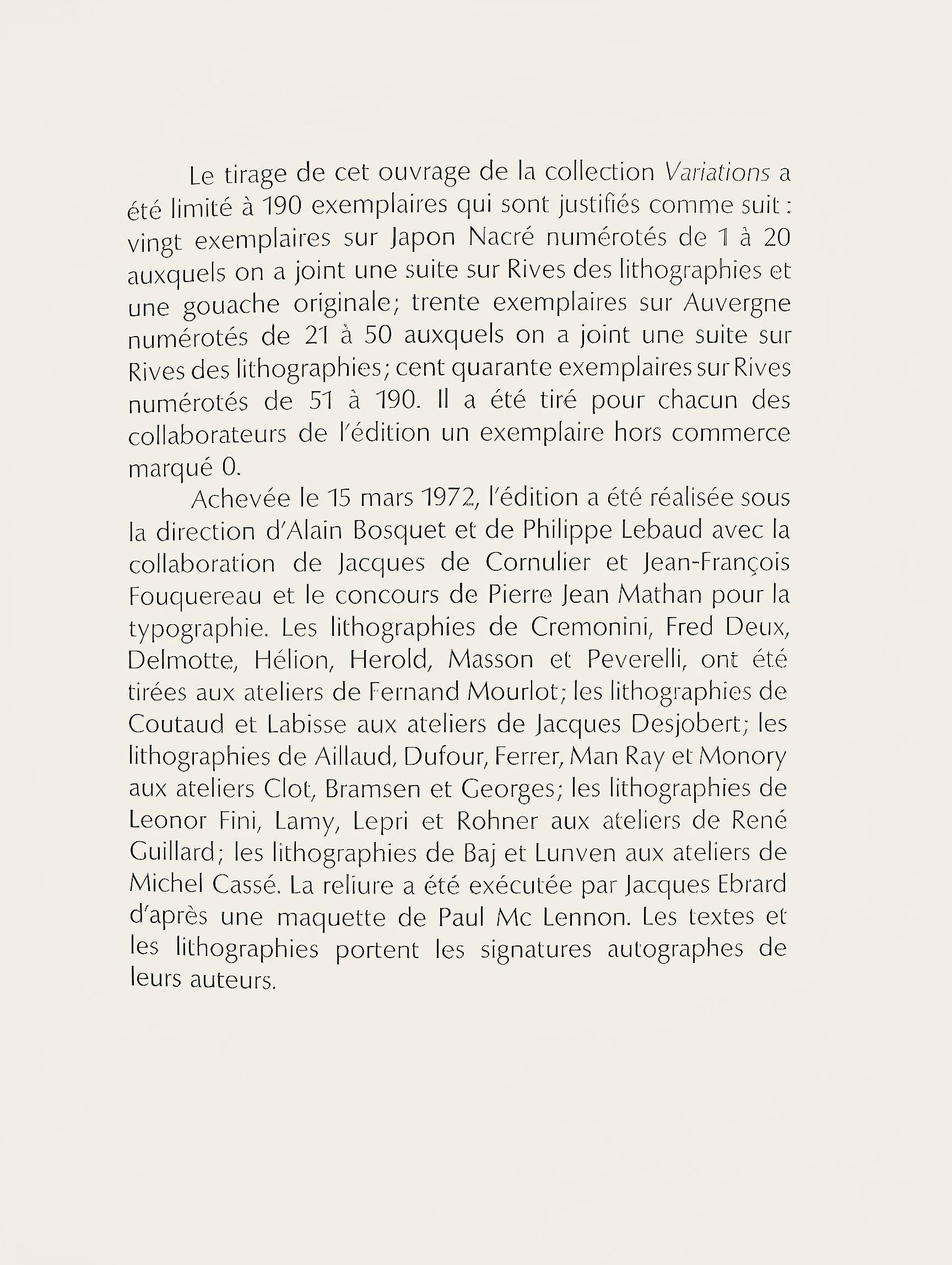 Excerpted from the volume (translated from French), The circulation of this work from the collection Variations has been limited to 190 examples which are justified as follows: twenty examples on Japon Nacr, numbered from 1 to 20 to which was attached a suite on Rives des lithographies and an original gouache; thirty examples on Auvergne numbered from 21 to 50 to which a suite on Rives des lithographies was attached; one hundred and forty examples on Rives numbered from 51 to 190.