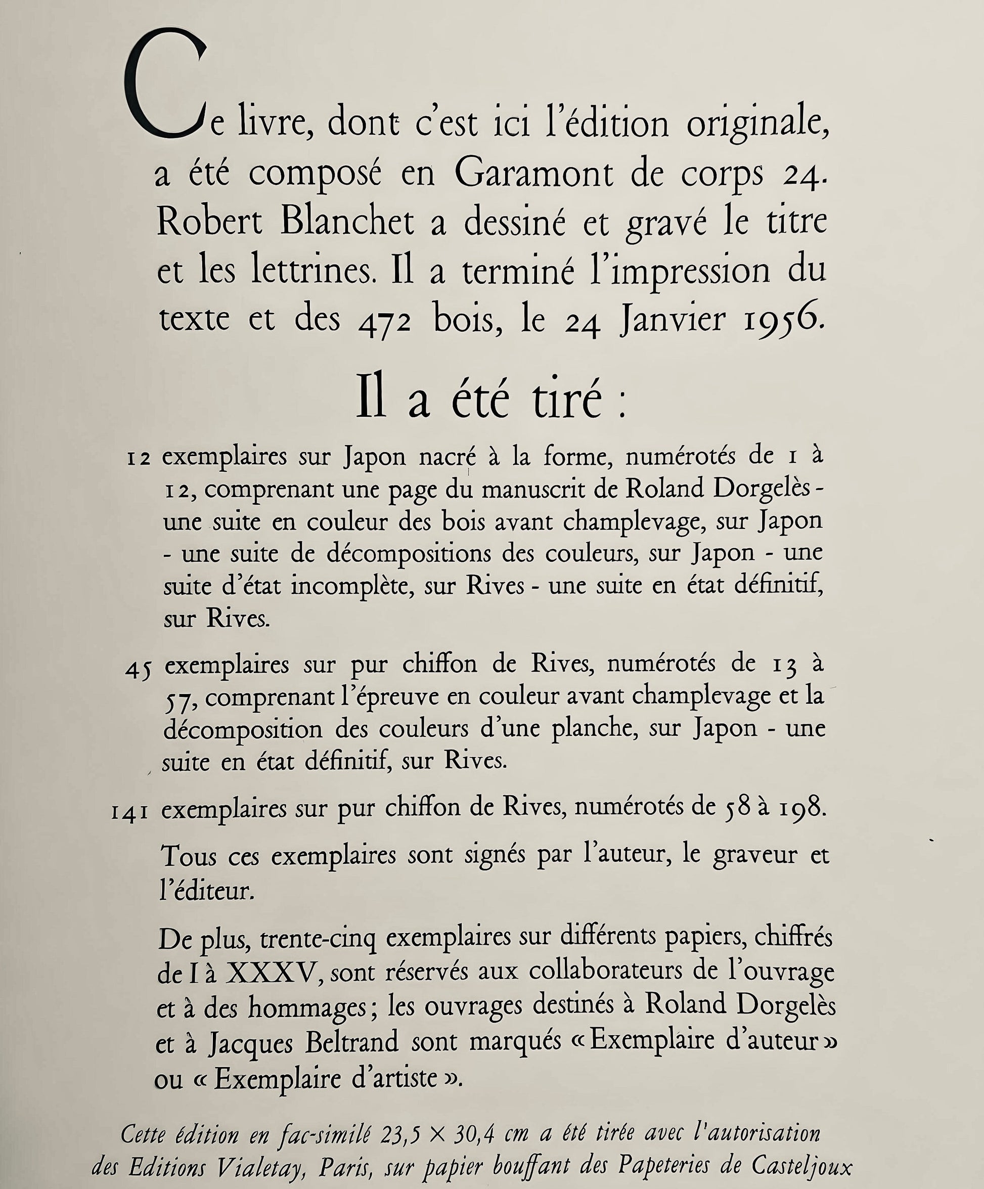 It was shot: XII examples on Japon nacr la forme, numbered from I to XII, including a page of Roland Dorgels' manuscript, a color suite of woodblocks before champlevage, on Japon; a series of color decompositions, on Japon; an incomplete state suite, on Rives; and, a sequence in a definitive state, on Rives.
