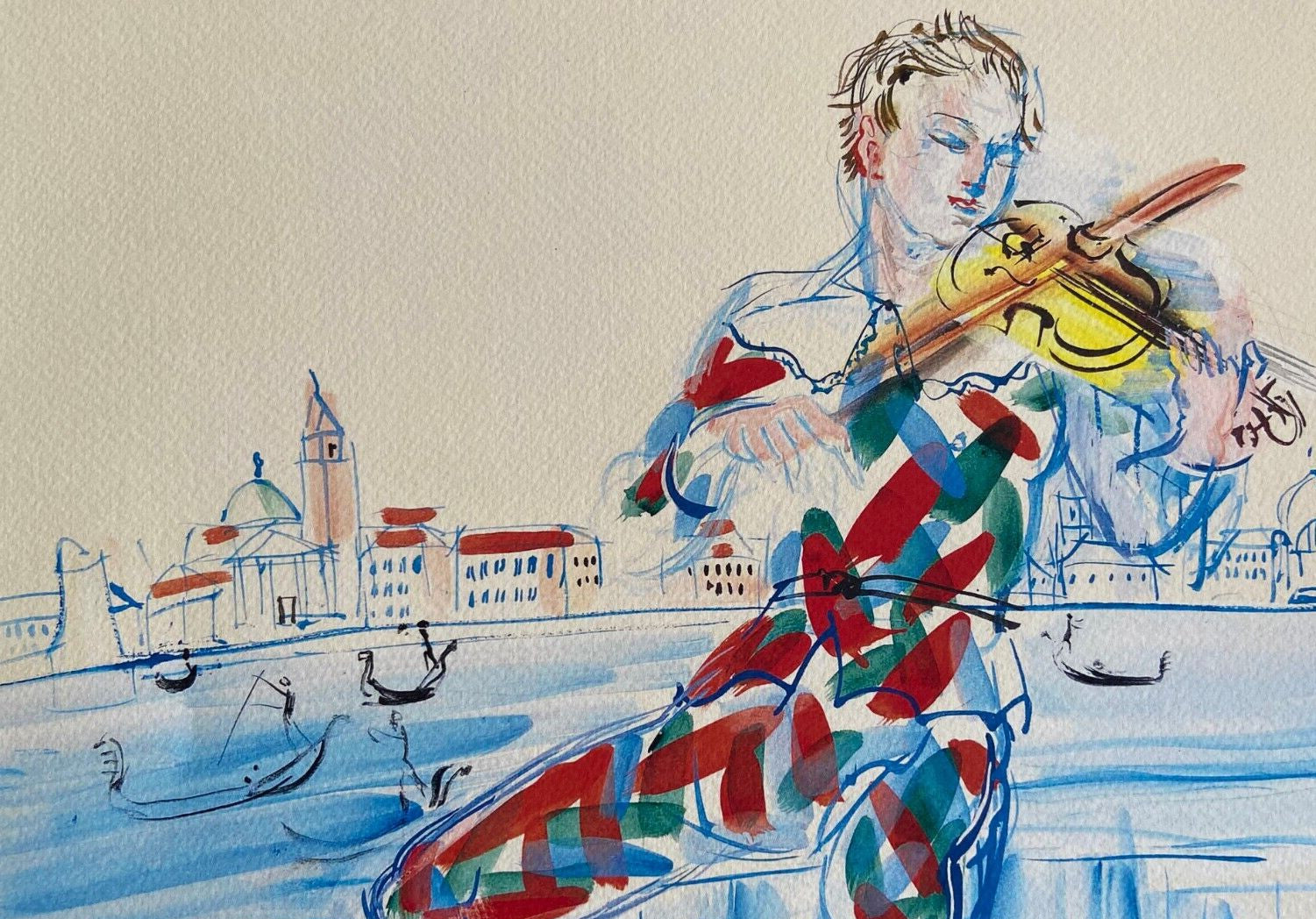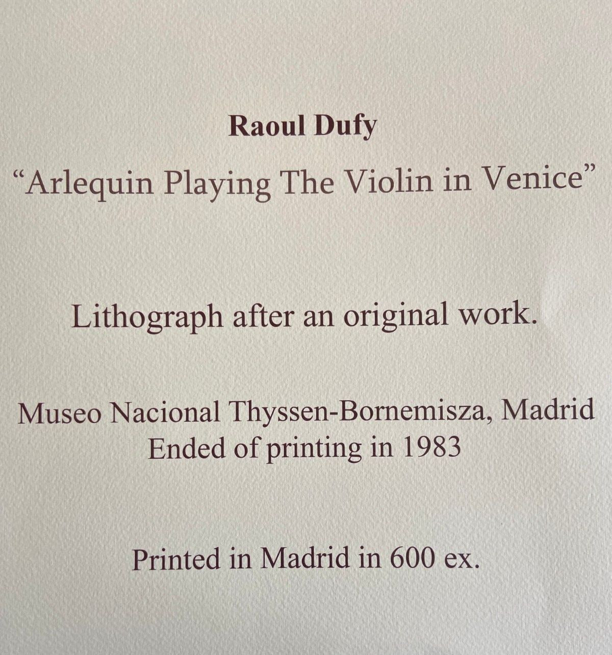 RAOUL DUFY " Harlequin playing the violin in Venice " Lithograph from an work by the master Raoul Dufy, printed in 1983 by the Thyssen-Bornemisza National Museum, Madrid. Signature Raoul Dufy on the plate. The graphic work measures 32 x 37 cm The circulation was s printed in Madrid in 600 ex. hand numbered. Museo Nacional Thyssen-Bornemisza, Madrid. Like Edgar Degas, Egon Schiele, Piet Mondrian, Georges Braque, Raoul Dufy, Ren Magritte, Edvard Munch, Gustav Klimt, Pau......